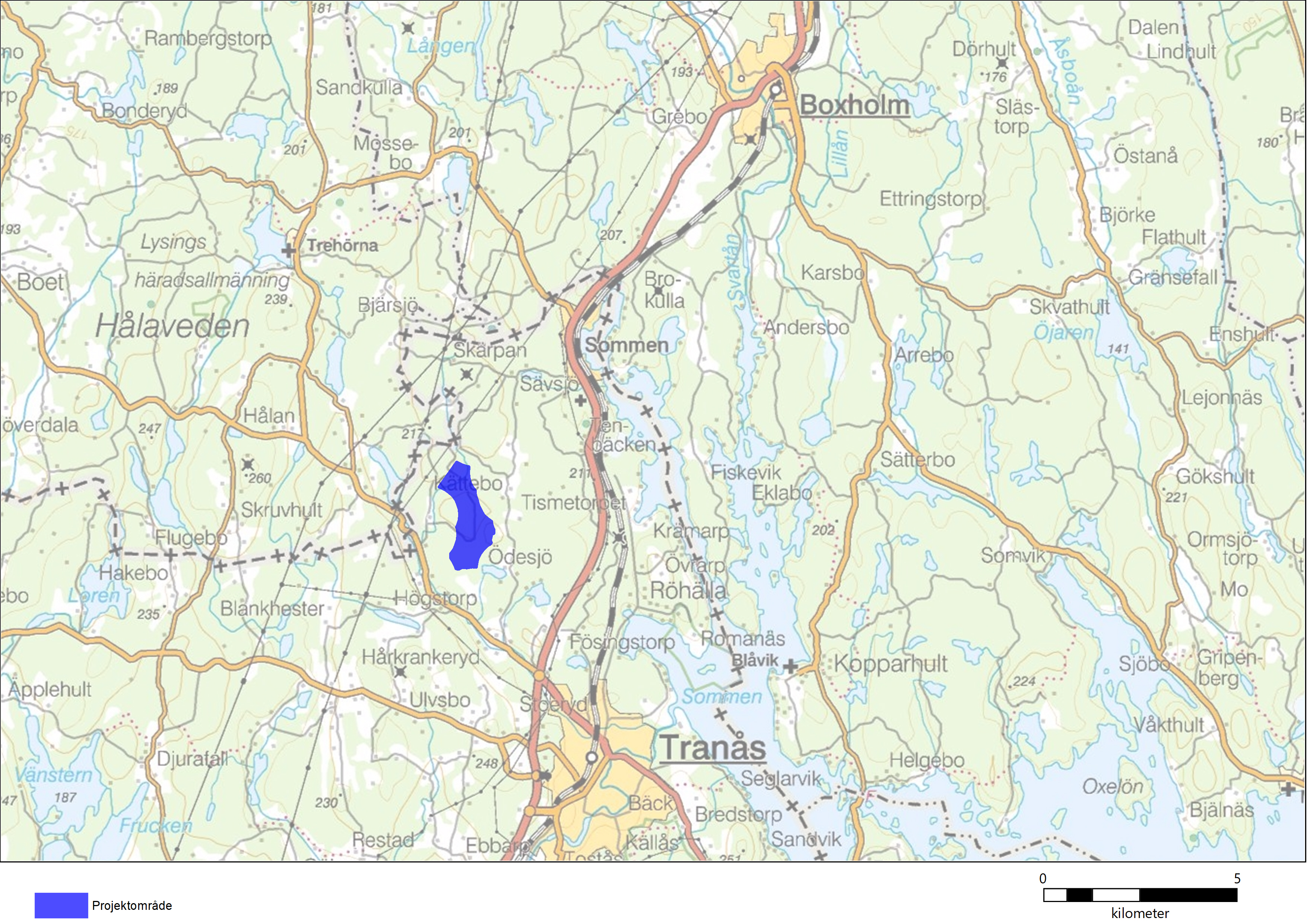 Området som berörs är beläget ca: 6 km nordväst om tätorten Tranås och bedöms kunna rymma som mest 4 vindkraftverk. Fastighetsägaren i området är Svenska kyrkan, Linköpings stift. Om utredningen mynnar ut i att man går vidare med planerna, kommer personer inom 4 kilometer från projektområdet att erbjudas möjligheten att bli delägare. Mer information om det presenteras på samrådsutställningen.
