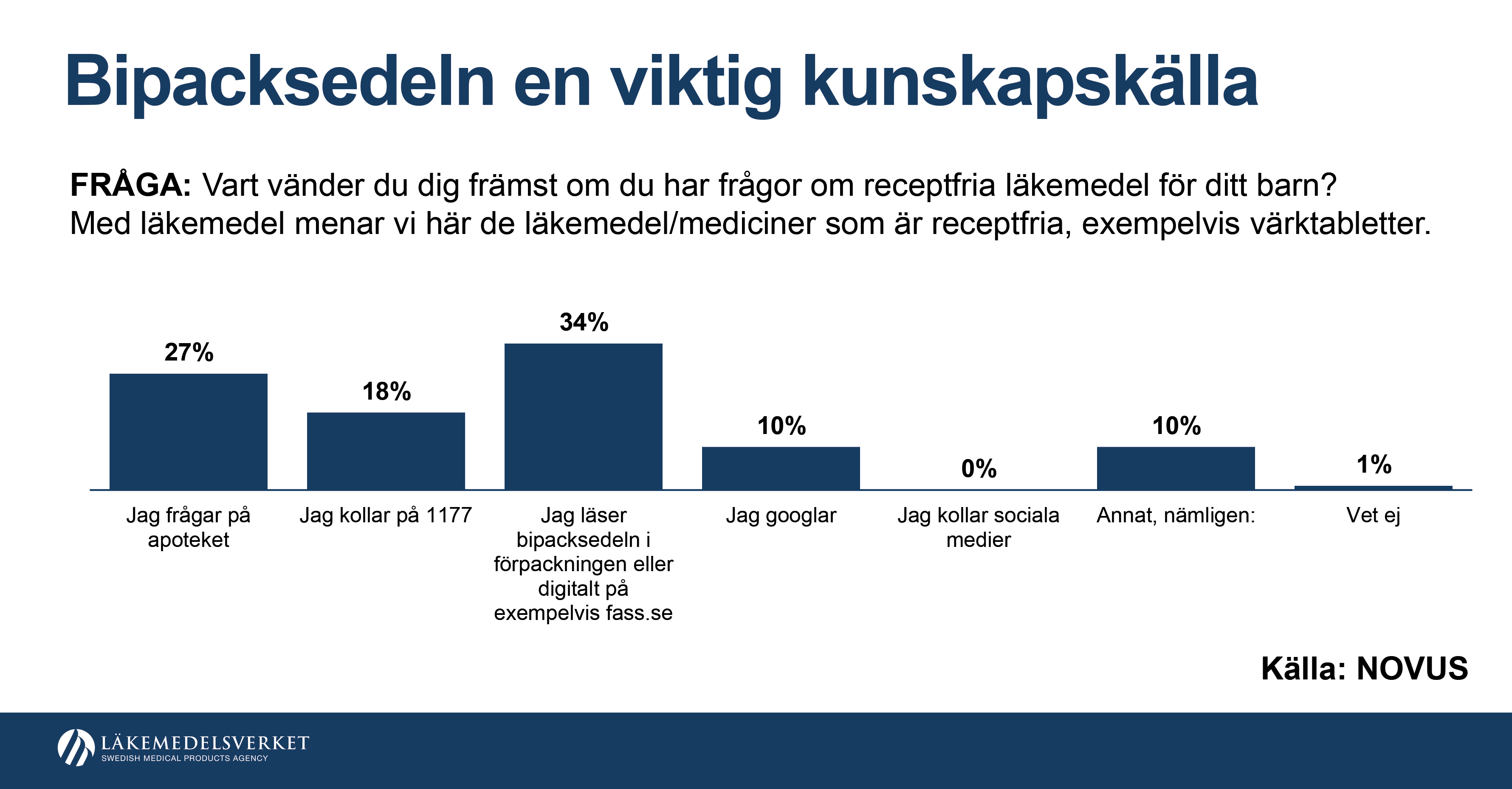 Så vart vänder sig föräldrarna när de har frågor om receptfria läkemedel för sitt barn? I störst utsträckning läser man bipacksedeln som följer med förpackningen eller tar del av den digitalt. Tre av tio frågar också på sitt apotek.