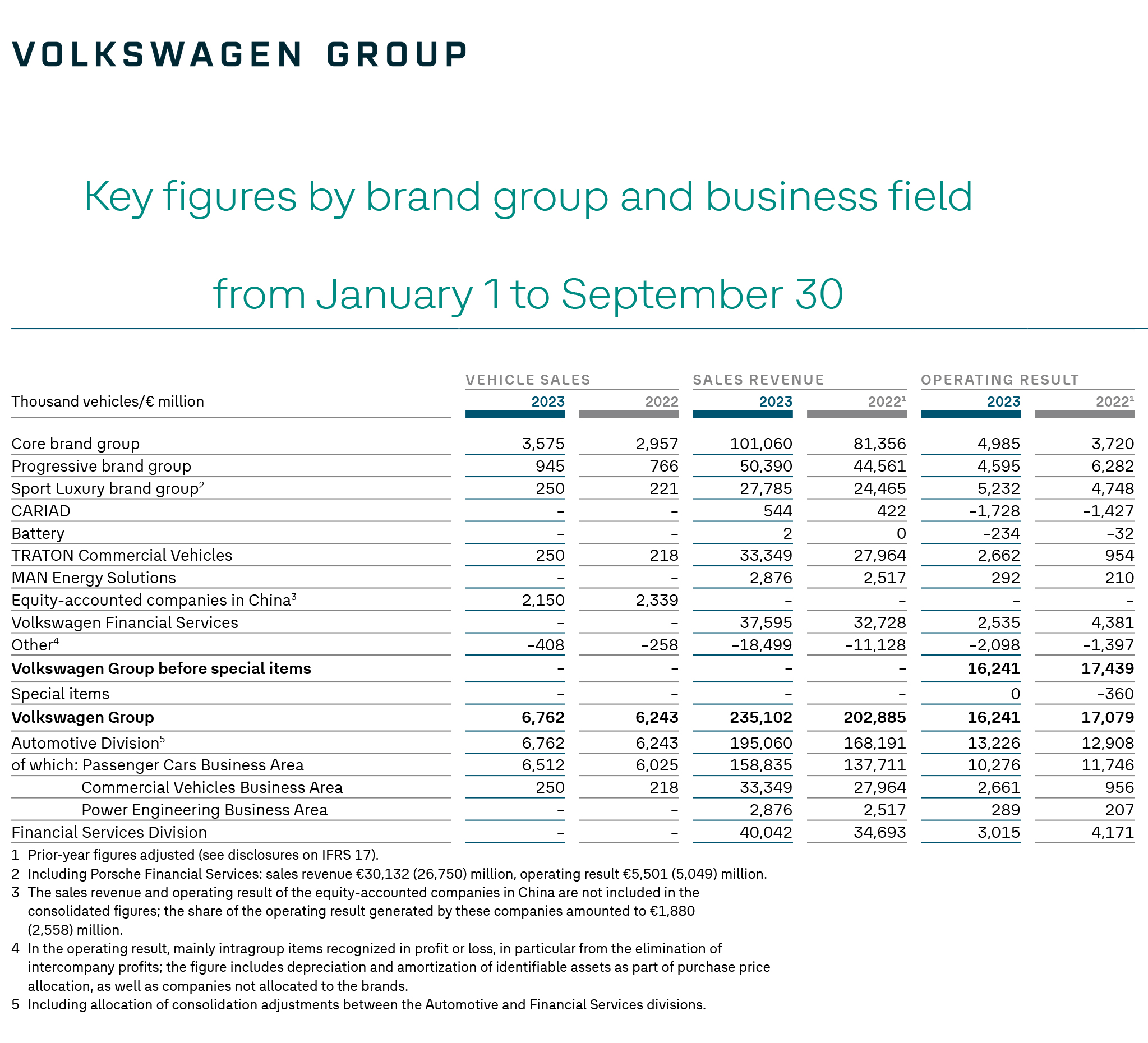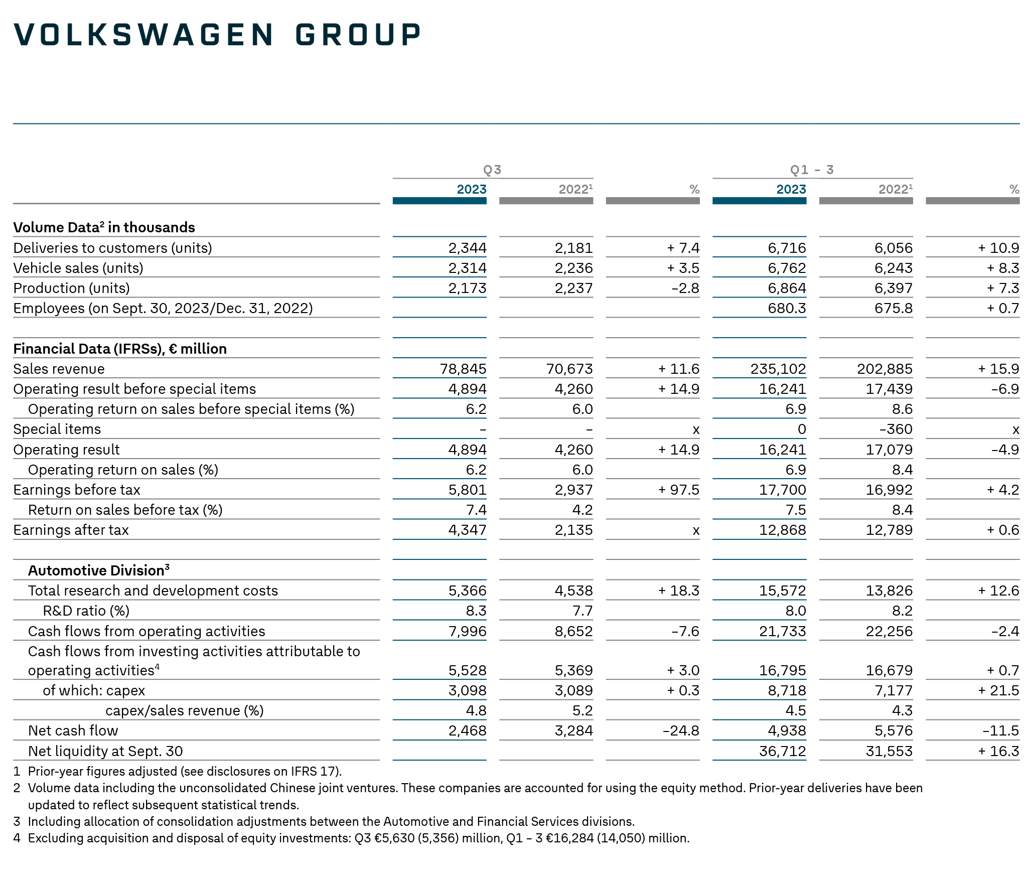 Volkswagen-koncernen uppnådde starka leveranser och ökade försäljningsintäkter under de första nio månaderna av räkenskapsåret 2023. Leveranserna ökade med 11 procent på årsbasis till 6,7 miljoner bilar (3:e kvartalet 2023: 2,3 miljoner bilar; +7,0 procent). Försäljningsintäkterna ökade med 16 procent till 235,1 miljarder euro (3:e kvartalet 2023: 78,8 miljarder euro, +12 procent). Orderstocken i slutet av tredje kvartalet 2023 låg kvar på en hög nivå på 1,4 miljoner bilar enbart i Västeuropa. Nettolikviditeten i Automotive Division förblev mycket stabil på 36,7 miljarder euro.