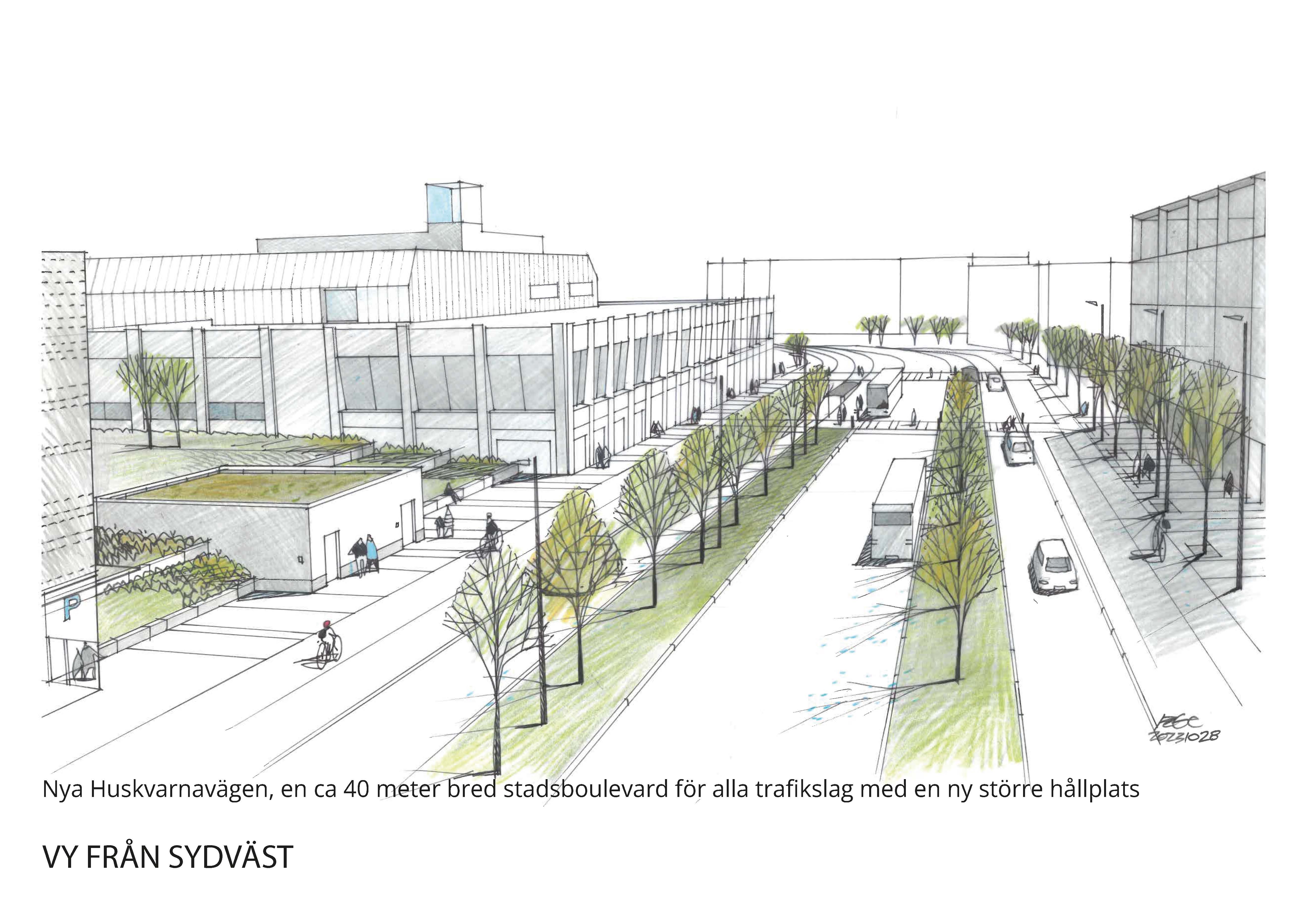 Nej, Huskvarnavägen inkluderas inte i det område som det här detaljplaneförslaget omfattar. I planförslaget finns dock skisser på Huskvarnavägen med, som visar hur gatan skulle kunna se ut i framtiden. För att kunna planera hur nya Rosenlundsbadet ska se ut har stadsbyggnadskontoret tittat på helheten för Rosenlund. I kommunens översiktsplan pekas Rosenlundsområdet ut som en så kallad blandstad med kvartersbebyggelse i framtiden – en innerstadsmiljö med flervåningshus och en stadsgata som innebär en bred gata som tillåter både bil- och kollektivtrafik och gång- och cykelväg och grönska.