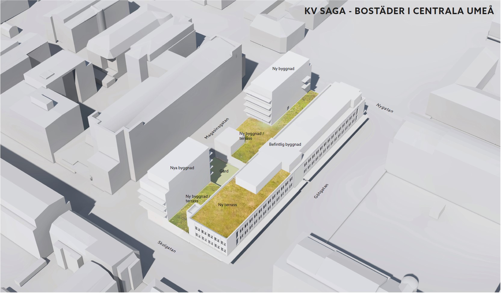 Detaljplanen gör det möjligt att komplettera kvarteret med nya byggnader i upp till fem våningar med en sjätte indragen våning. Utöver lägenheter blir det cirka 2 000 kvadratmeter för kontor och så kallande centrumverksamheter, som till exempel restauranger eller butiker. Verksamheterna kommer i huvudsak att placeras på entréplanet för att stärka området och kopplingen till Renmarkstorget. Planen reglerar även att entréplanet ska glasas upp för att passa in i omgivningen och bidra till gatuliv. Sagagallerian blir kvar men kan med den nya detaljplanen inrymma bostäder på de övre våningsplanen.