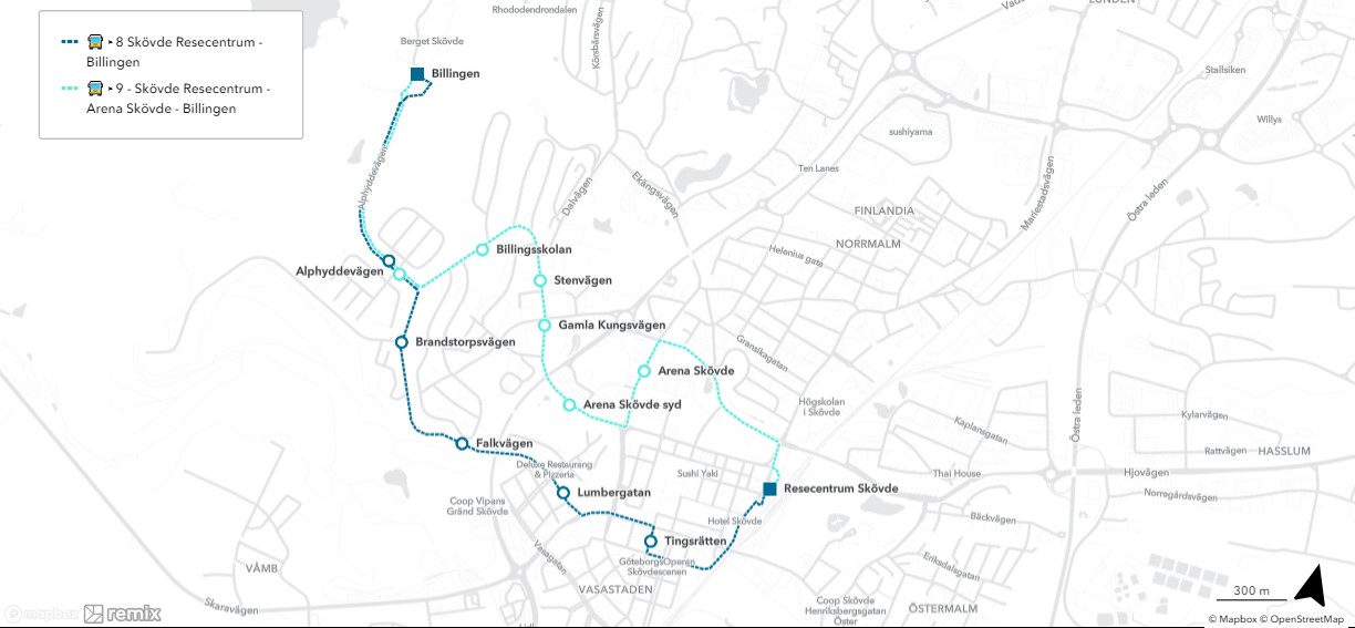 Mellan Resecentrum och Billingen går i nuläget linje 8 längs Södra Bergvägen. Men från och med den 10 december delas linje 8 upp i två. Nya linje 9 kommer då att köra mellan Resecentrum och Billingen längs Norra Bergvägen, via Arena Skövde. Linje 8 fortsätter köra samma väg som idag. Båda linjer kör en gång i timmen per riktning.