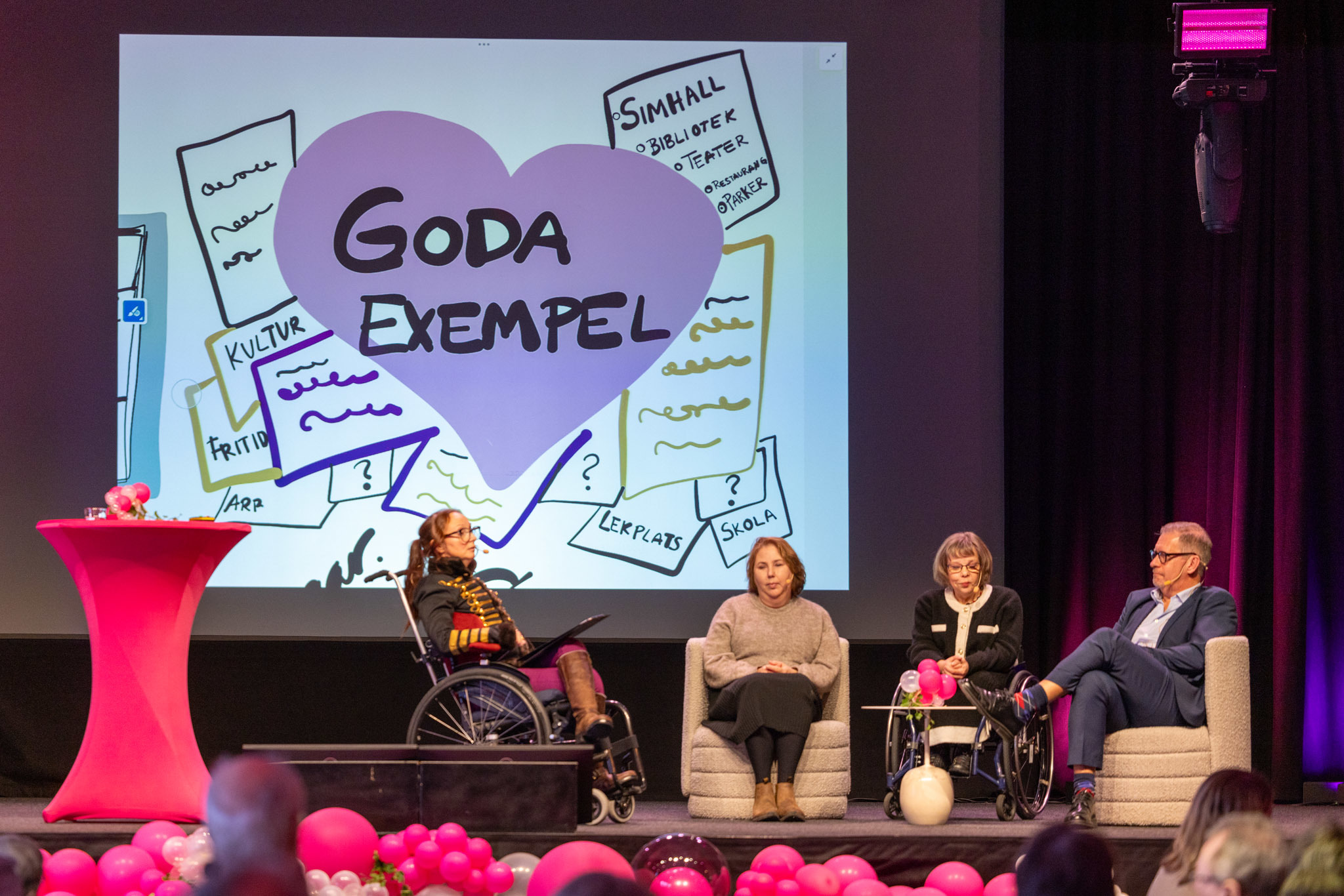 Panelsamtal med Malin Ekman Aldén, generaldirektör för Myndigheten för delaktighet, DHRs förbundsordförande Åsa Strahlemo och tillgänglighetsexpert Thomas Wilhelm, under ledning av moderator Annika Taesler. Fotograf Liza Simonsson DHR press