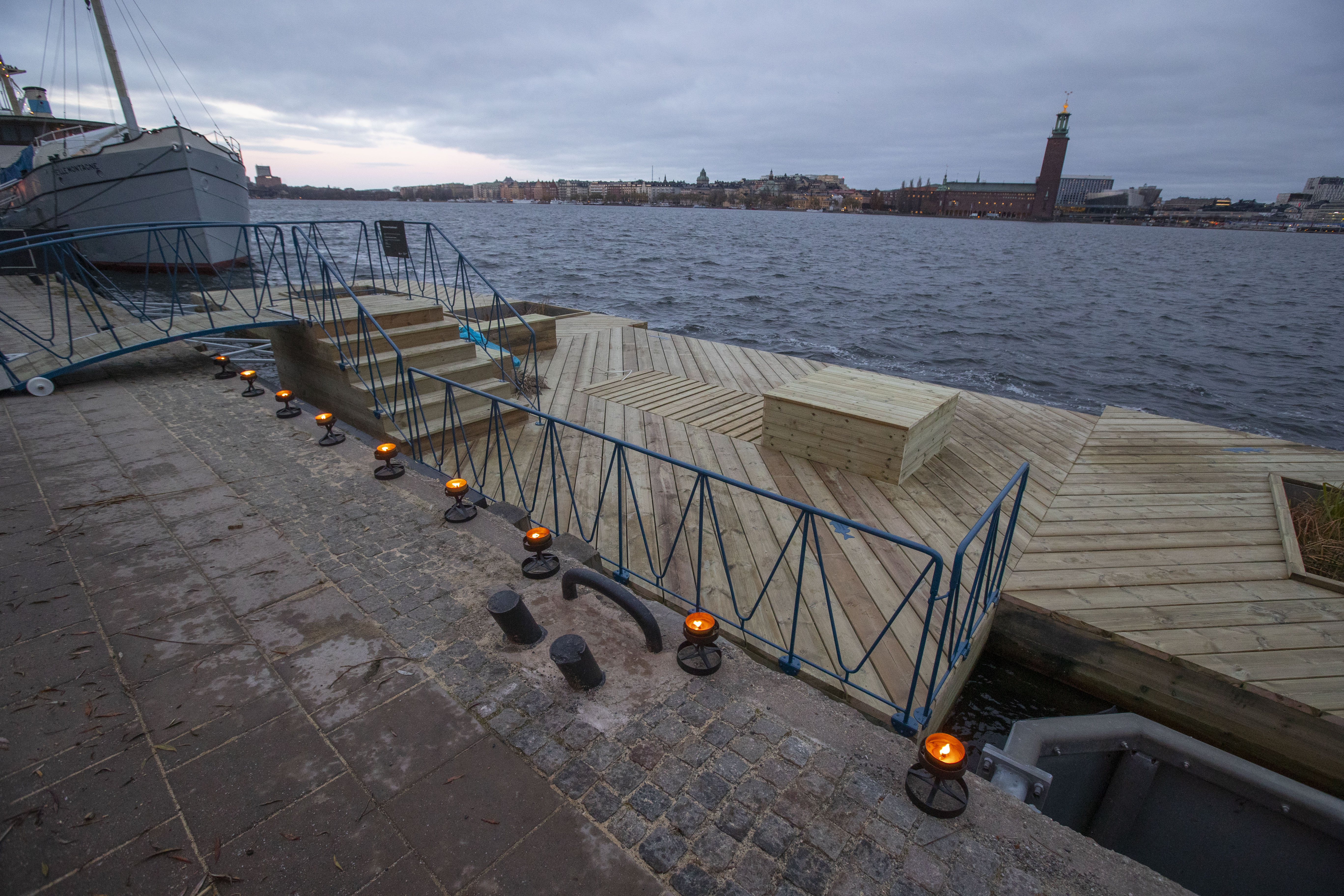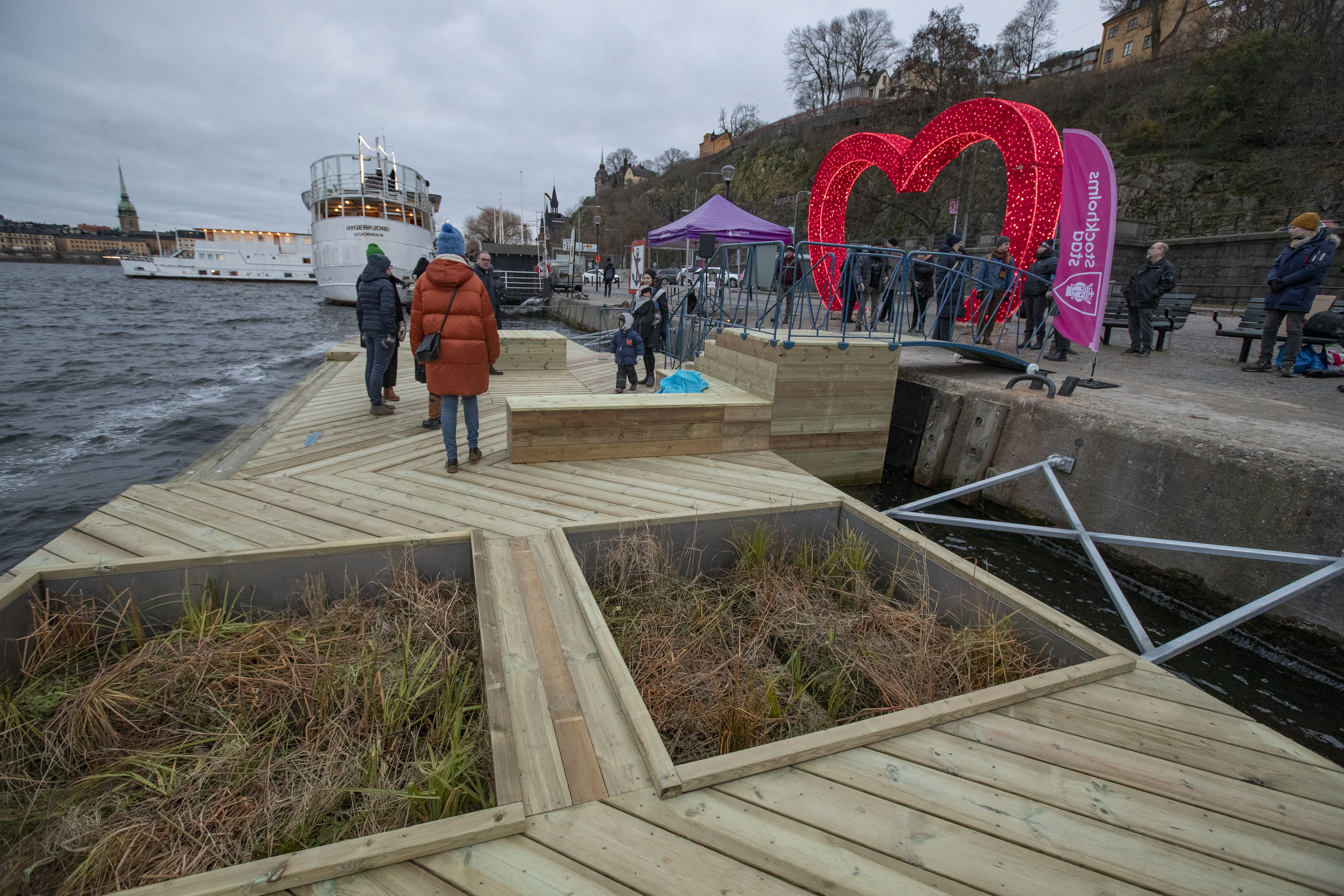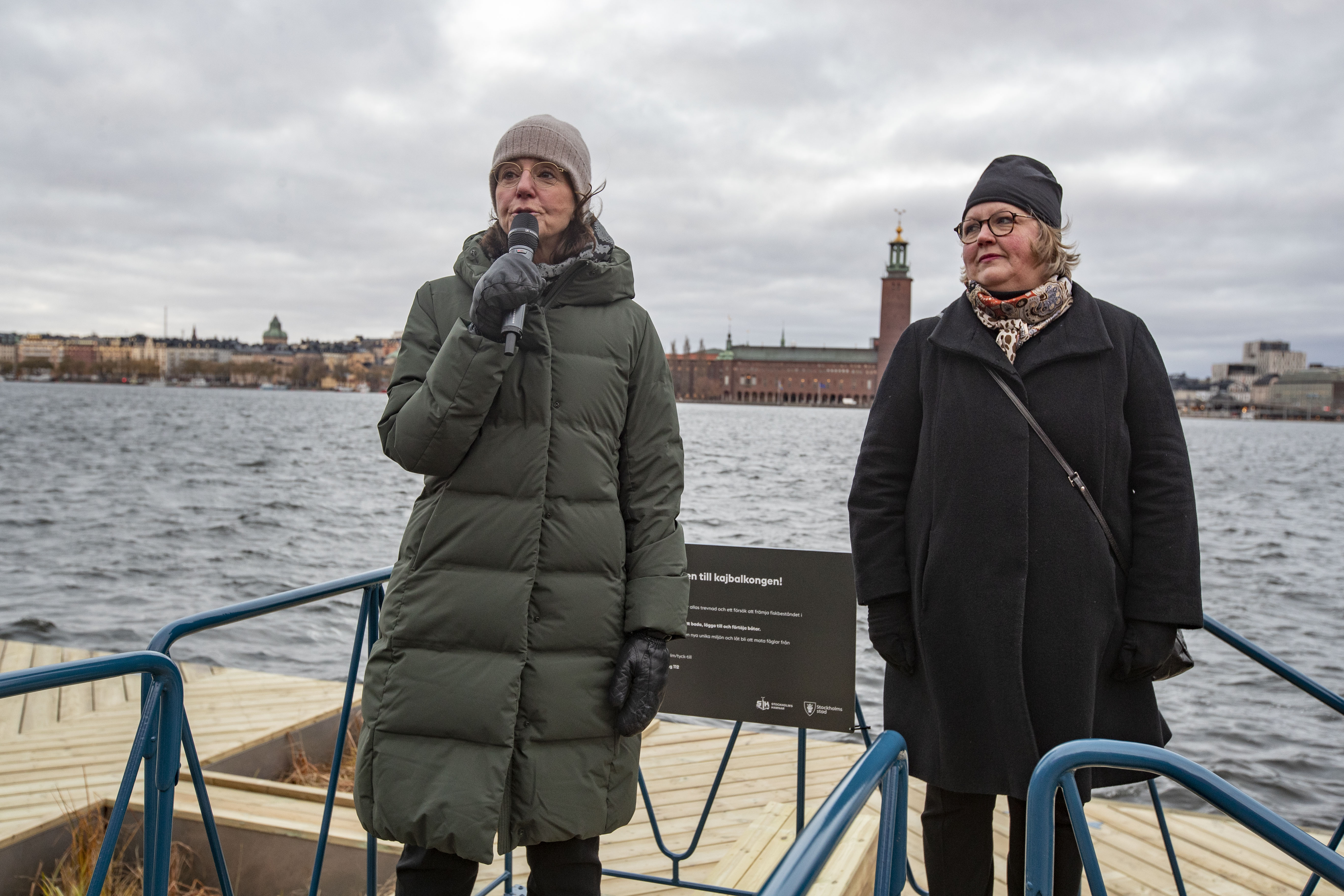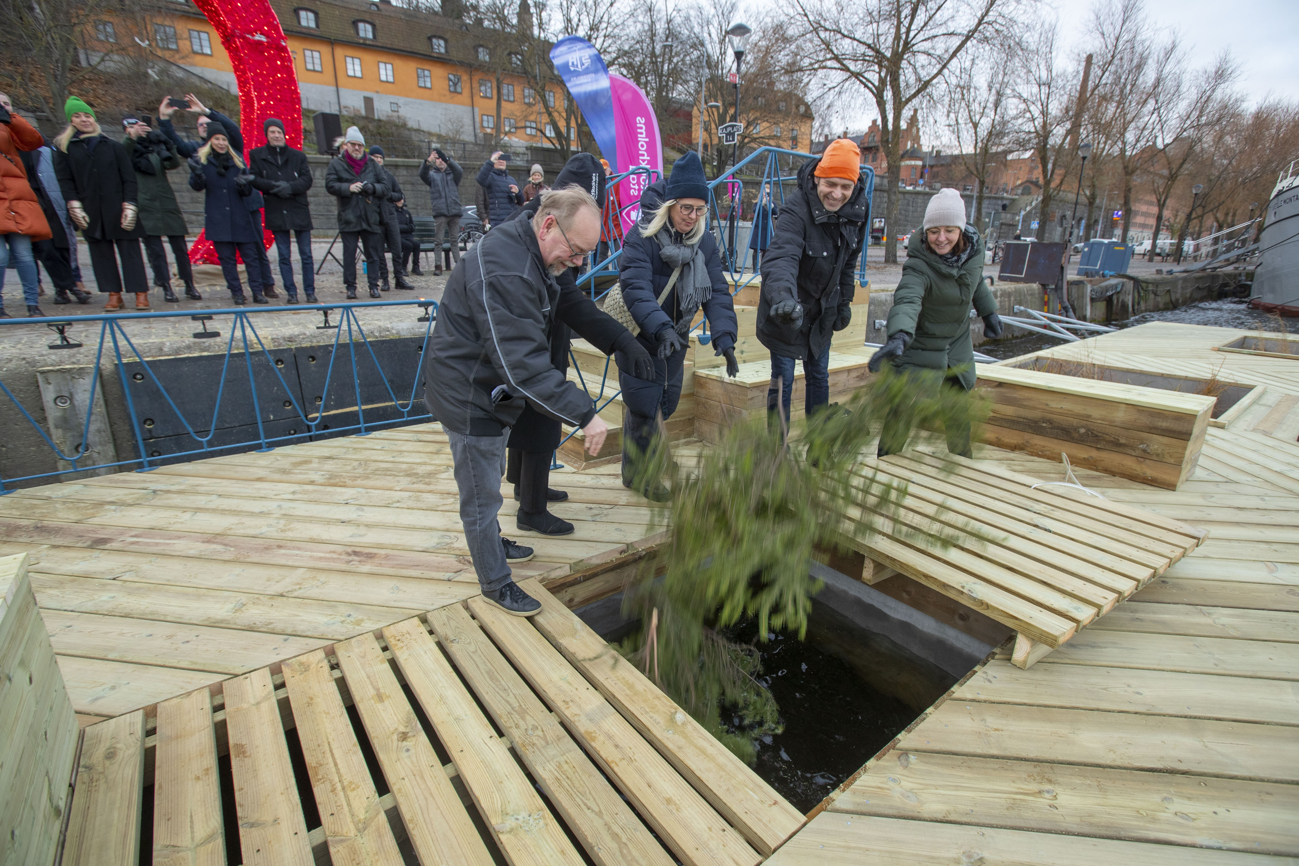 Idag, fredag 24 november, invigdes Stockholms första kajbalkong i gryningen på Söder Mälarstrand. Trafikkontoret, idrottsförvaltningen och Stockholms Hamnar samarbetar om kajbalkongen och invigde den genom att lägga ner granris i korgen under balkongen för att välkomna inte bara stockholmarna ovanpå kajbalkongen utan även fiskarna under den.