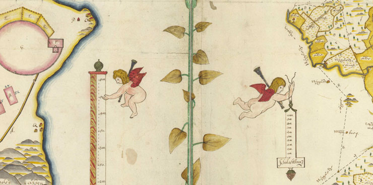 Ett motiv med ett örlogsskepp och ett handelsfartyg pryder en annan karta från år 1700. Det är gjord av Adolf Castman, som tog lantmätarexamen 1696 och började arbeta i Östergötland. Han fick i uppdrag av fru Elisabet Crusebjörn att kartera sex hemman utanför Norrköping. I en karmstol till vänster på kartan sitter en figur som sannolikt är ett porträtt av fru Elisabet själv, en myndig dam som ägde flera gårdar i Kvillinge socken. Var det Castmans båtintresse som ledde till att han i början av år 1700 sökte en tjänst på amiraliteten? Han tog värvning och dog 1705 i slaget om Warszawa.