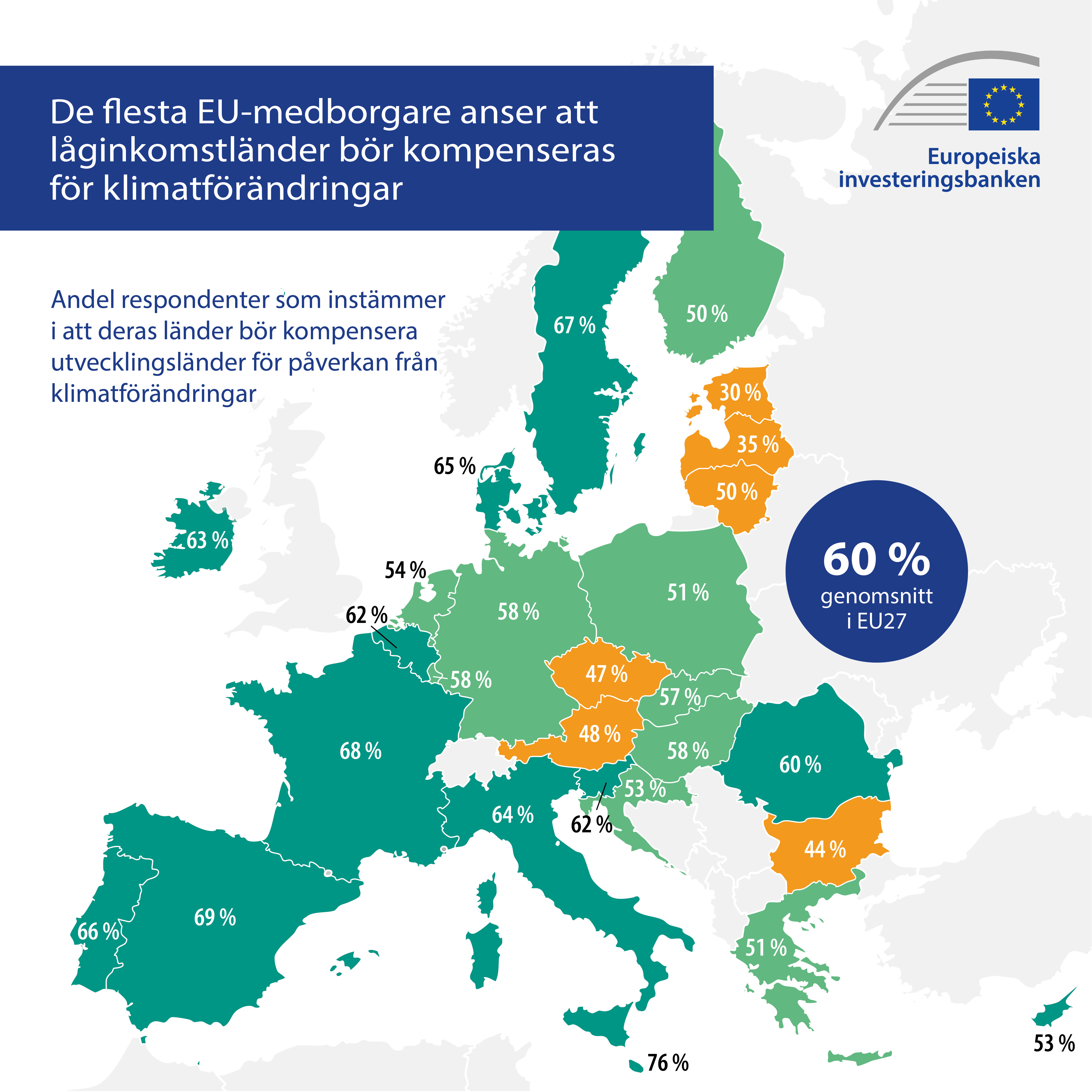 67 procent av respondenterna (7 procentenheter över genomsnittet i EU och 9 procentenheter över Tyskland, exempelvis) instämmer i att landet bör kompensera drabbade länder ekonomiskt för att hjälpa dem att bekämpa klimatförändringarna.