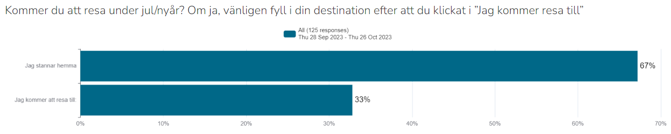 Julen och dess helger börjar närma sig. En tid då många svenskar väljer att resa utomlands. Även i år, trots det ekonomiska läget, så verkar det finnas en längtan till varmare breddgrader. En kundundersökning gjord av Europeiska ERV visar att medan 67 % av svenskarna väljer att stanna hemma i år, så anger 33 % att de kommer att resa iväg under julhelgerna1. Det går att jämföra med 41 % som uppgav att de skulle stanna hemma under hösten, medan 59 % meddelade att de skulle resa under höstperioden2.