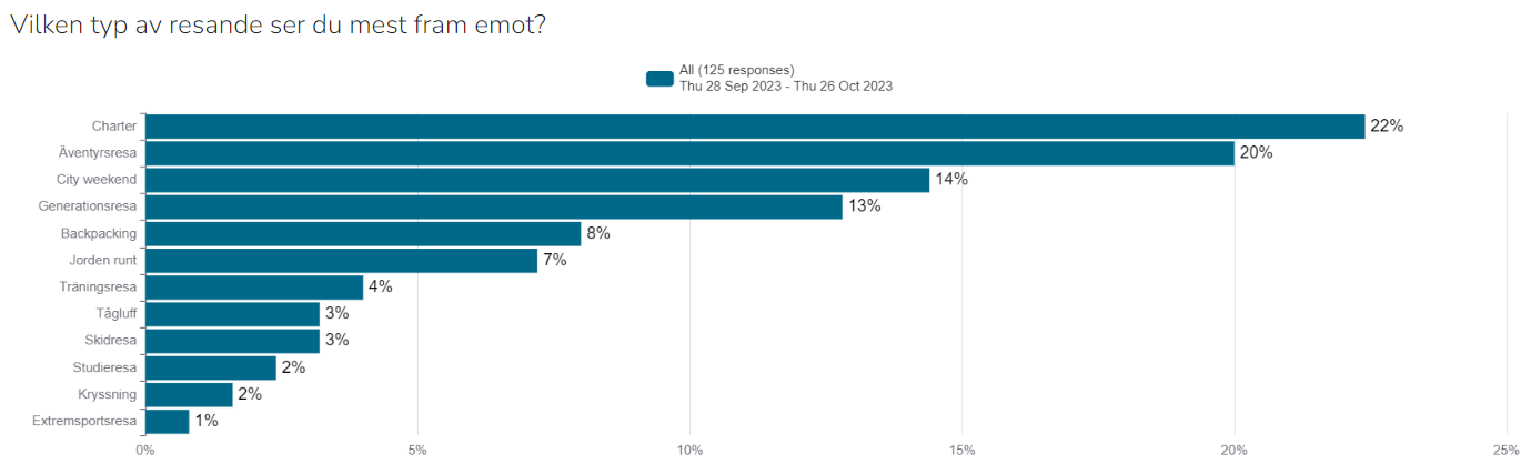 Så vad planerar resenärerna att göra under sin semester då? Det är relativt spritt mellan olika restyper. Men enligt undersökningen så ser flest fram emot att njuta av en charter (22 %), följt av att uppleva en äventyrsresa (20 %)3. Det är dock inte bara avkoppling och äventyr som står på vinterresenärernas Att göra-lista. 13 % uppger nämligen att de kommer att kombinera delar av sin resa med arbete. Något som blivit allt mer populärt i spåren av covid, när digitaliseringen och möjligheterna att arbeta utanför kontoret fick en skjuts framåt.