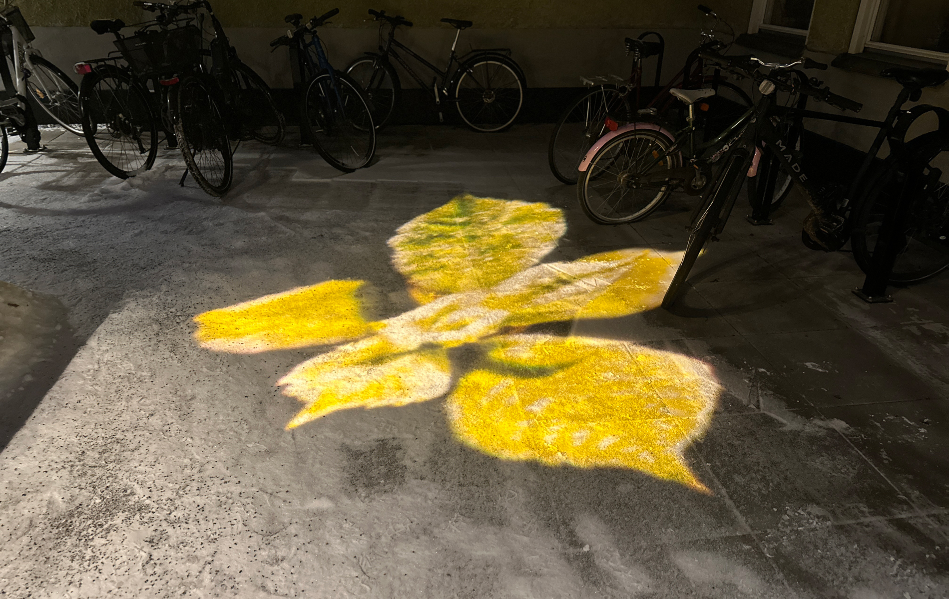 Bild på det ljus-konstverk som föreställer en skogsglänta på en av Einar Mattssons innergårdar