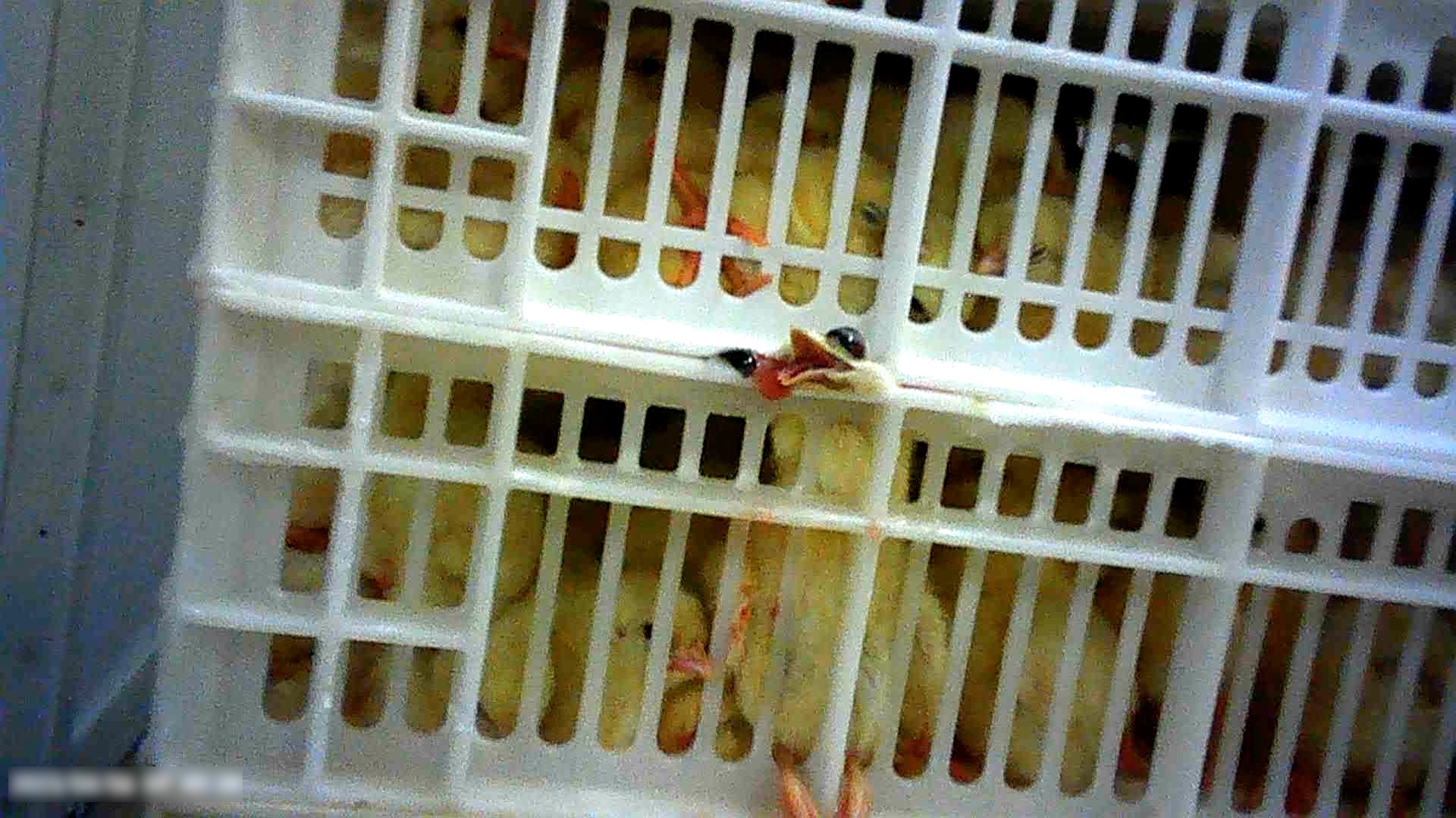 I slutet av sorteringsmaskinen sprutas kycklingarna ut i nya plastbackar som sätts på varandra i staplar. Därefter placeras de i ett lastrum i väntan på djurtransporter som kör kycklingarna till uppfödningsgårdarna. Under sin första dag på kläckeriet får djuren varken mat eller vatten.