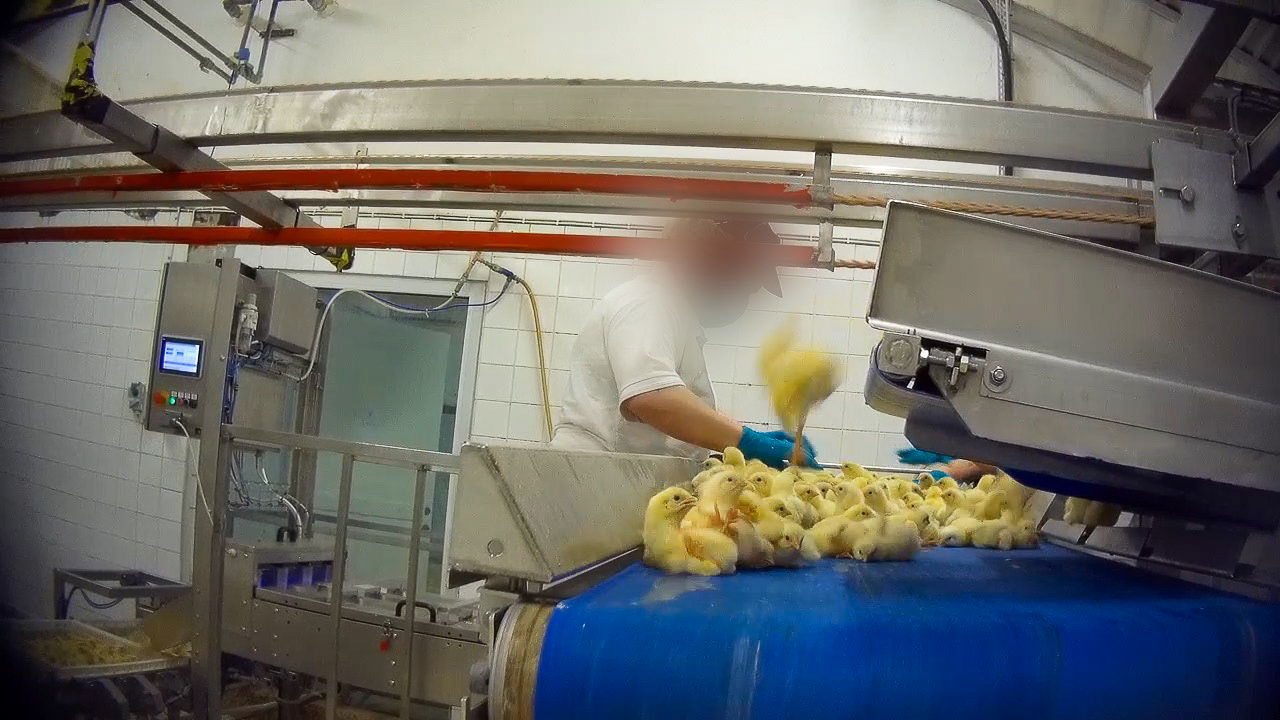 Genom att ha arbetat undercover kan Djurrättsalliansen nu visa hur svenska kycklingars första dag i livet ser ut. De slungas runt i en maskin, sprutas ut på rullband, äter på varandra, kläms mellan backar och lämnas att plågas i timmar.