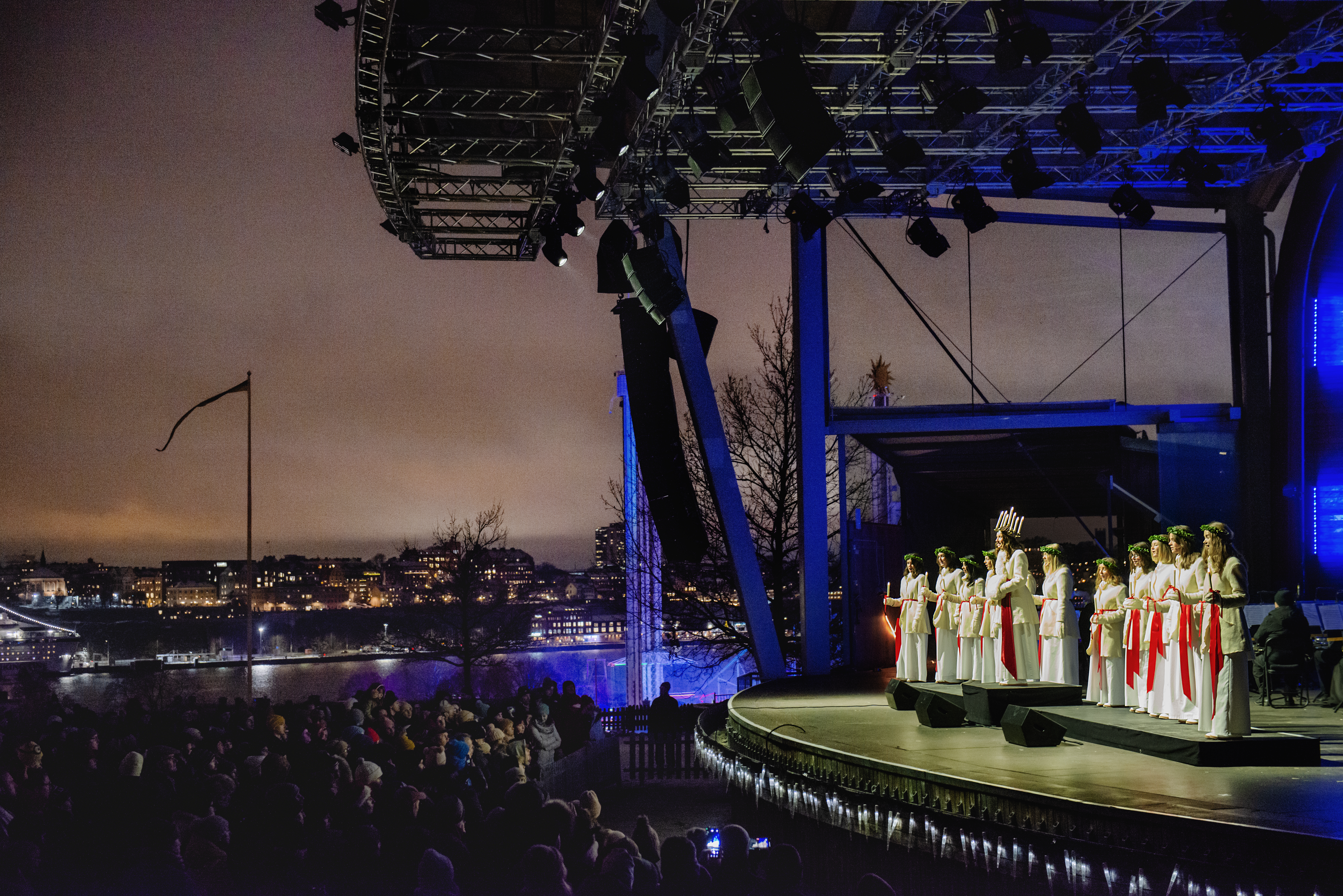 Njut av Skansens traditionella luciafirande där elever från Stockholms Musikgymnasium bjuder på konsert från Sollidenscenen.