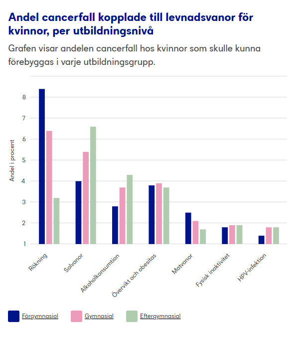 För första gången någonsin i Sverige inkluderar beräkningarna hur socioekonomi hör ihop med cancer kopplat till levnadsvanor. Rökning och solvanor står för de tydligaste skillnaderna; tre gånger fler cancerfall kan kopplas till rökning bland de med kort utbildning jämfört med de med lång utbildning. För solvanor är sambandet det omvända – för de med eftergymnasial utbildning kan solvanor kopplas till sju procent av alla cancerfall, jämfört med drygt fyra procent för de med förgymnasial utbildning. För övriga levnadsvanor syns inga, eller mycket små, skillnader beroende på socioekonomisk status.