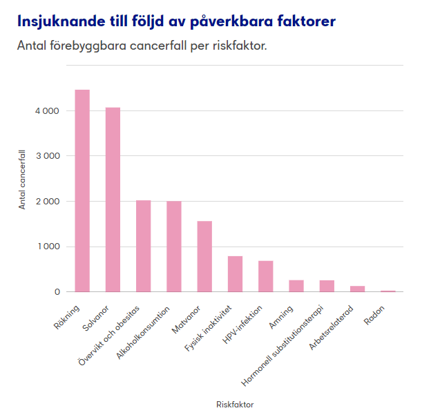 Bland våra levnadsvanor är rökning fortfarande den största riskfaktorn för cancer och står för totalt 6,3 procent av alla cancerfall. På andra plats kommer solvanor, som står för 5,8 procent av alla cancerfall i form av malignt melanom.