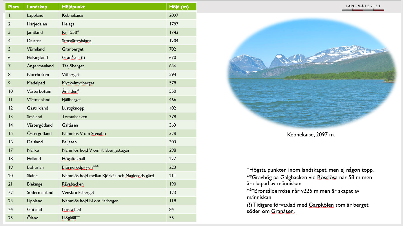 Lantmäteriet publicerar nu en lista på de svenska landskapens högsta toppar som ett led att uppmärksamma Internationella bergsdagen som inträffar den 11:e december varje år och som firas runt om i världen. Denna dag instiftades av FN år 2003 för att uppmärksamma bergens betydelse för människor och miljö.