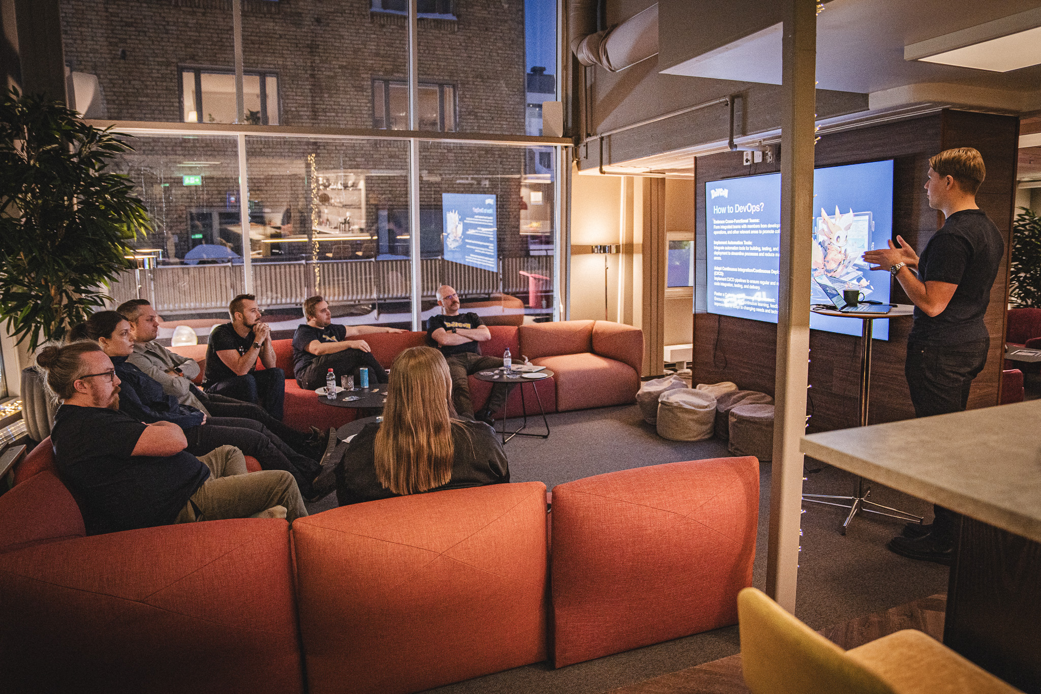Årets DevCon innehöll en inspirerande eftermiddag (som senare gick över till en tidig men underhållande kväll) full med föreläsningar och övningar. Deltagarna delades in i grupper och fick göra allt från att skapa produkter och pitcha dessa, till att delta i djupare samtal om utvecklarrollen — är det viktigt att projekten en arbetar med har ett större syfte, eller är kundnöjdheten den ultimata tillfredsställelsen? Gruppen i Stockholm landade i att kombinationen av dem båda får en att alltid vilja utvecklas.
