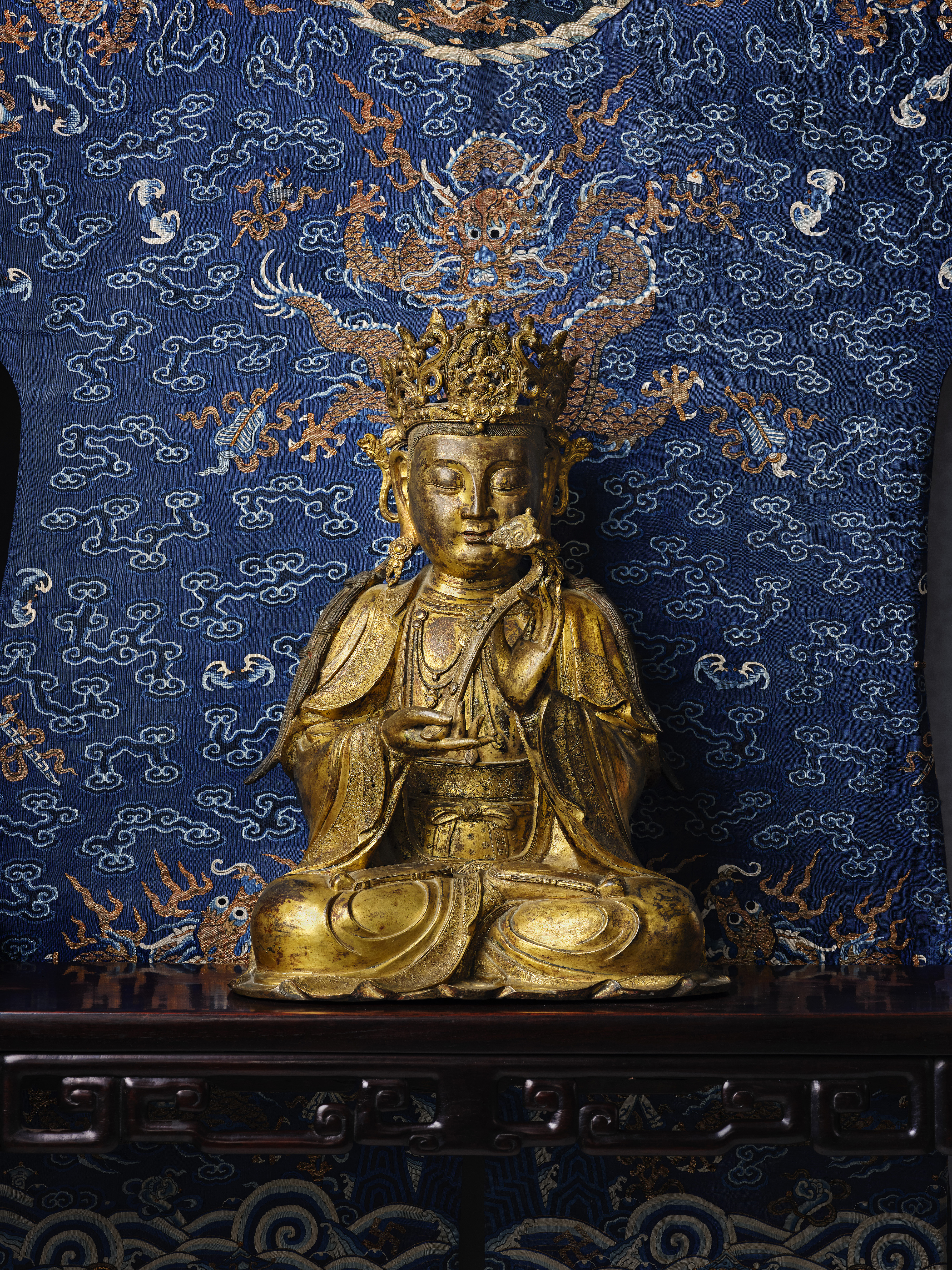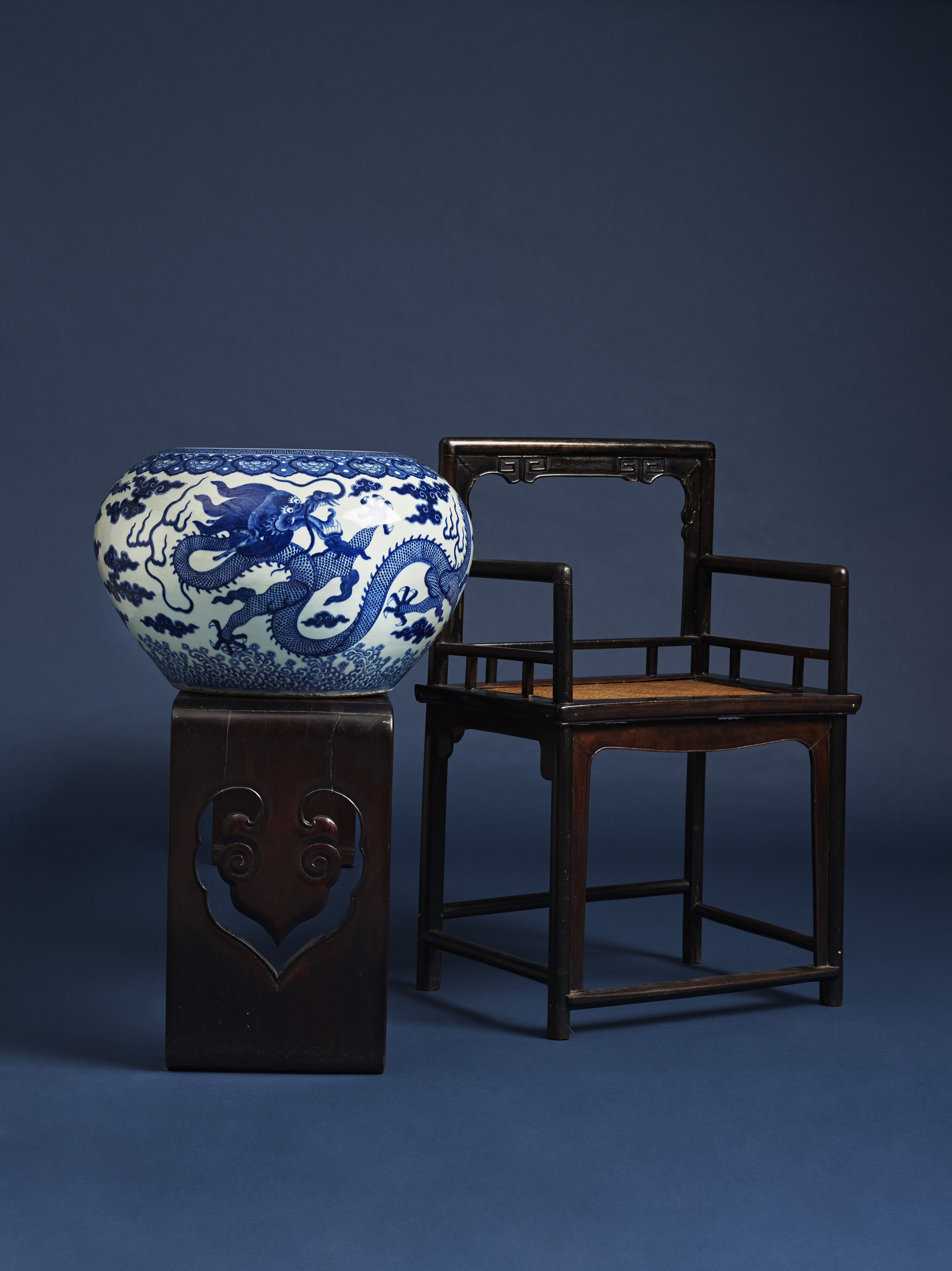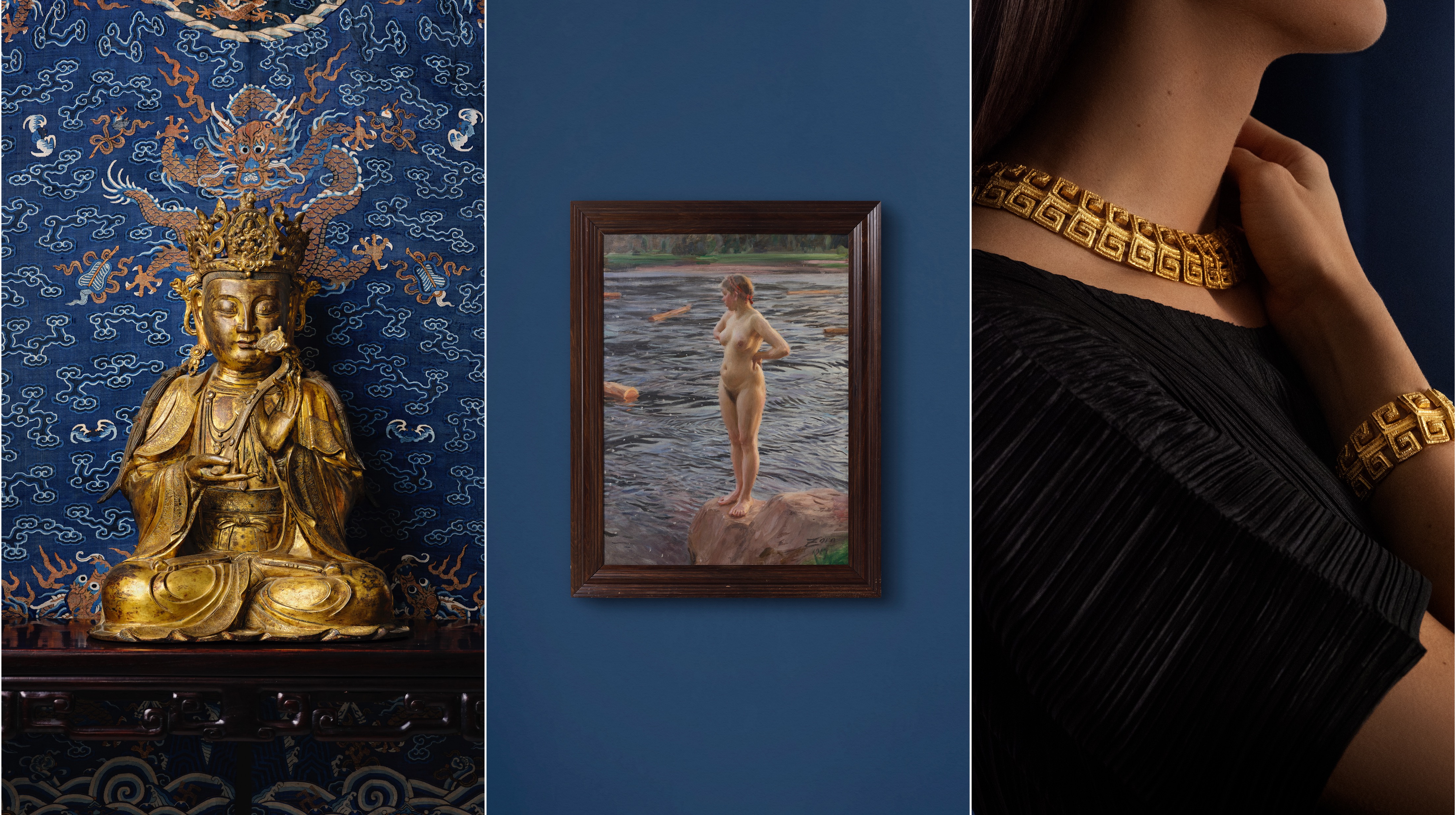 Avslutningsvis är vi stolta över att presentera vår asiatiska avdelning som innehåller fina objekt från flera betydande privata skandinaviska samlingar av keramik, cloisonné, jade, ”scholars objects”, textilier och kinesiska möbler. Höjdpunkter inkluderar en stor Bodhisattva i förgylld brons från Mingdynastin, med proveniens Hedi Boyce Broström, en Bodhisattva i porslin med Yongzheng-märke och ett högkvalitativt utbud kejserligt porslin, däribland en gul skål med utsökt dekor i form av gröna femkloade drakar och fenixfåglar med Daoguangs sigillmärke. Inom porslin ser vi även en elegant vas i blått och vitt från Qingdynastin och en jardiniere med femkloade drakar som strider om den flammande pärlan bland molnformationer och skummande vågor.