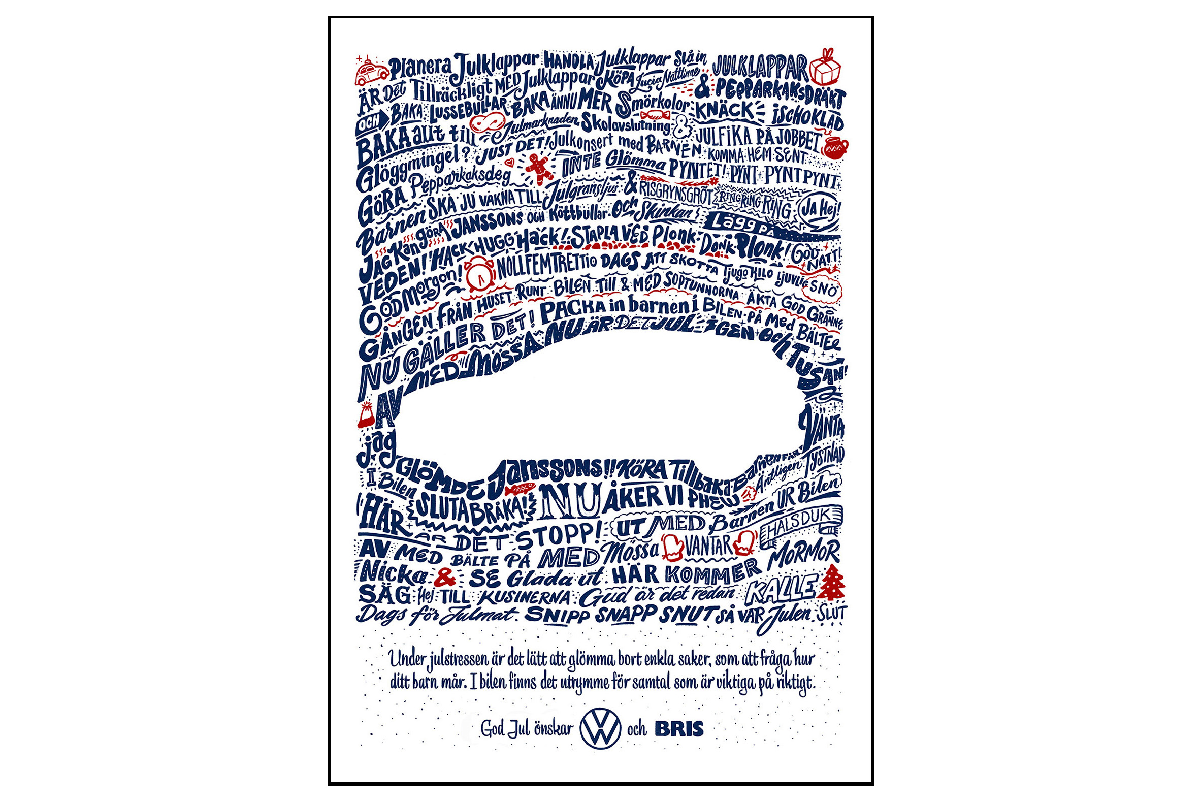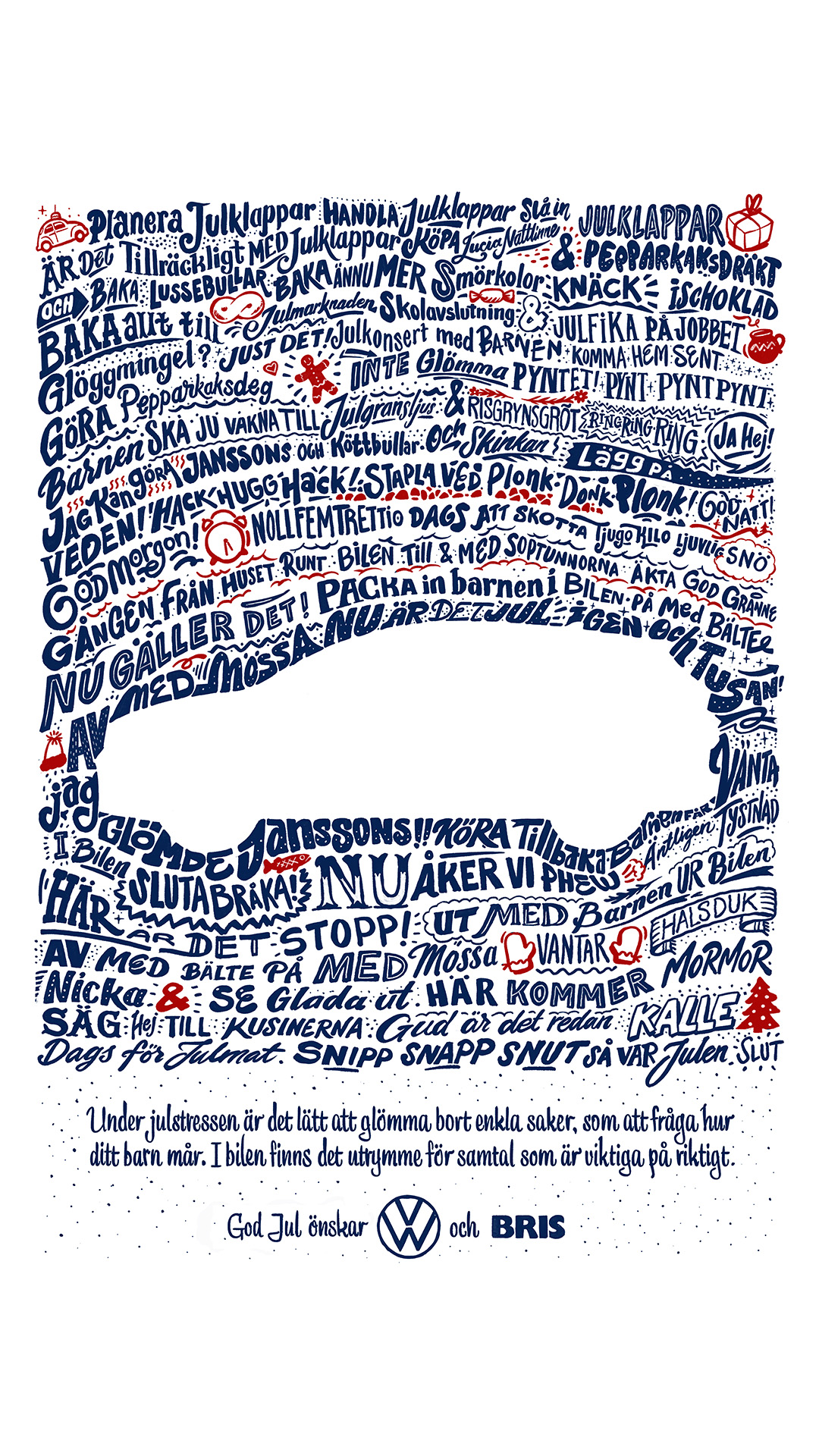 Många svenskar spenderar en stor del av julen i bilen på väg till släkt och vänner. Dessa resor är ett bra tillfälle att prata med sina barn, men i julstressen kan det vara svårt att komma ihåg att ställa de enklaste av frågor. I en ny julkampanj från Volkswagen och samarbetspartnern Bris vill man därför påminna föräldrar om vikten av att fråga sina barn om hur de mår och uppmana till att nyttja tiden tillsammans i bilen till de allra viktigaste av samtal. Kampanjen är framtagen tillsammans med NORD DDB.