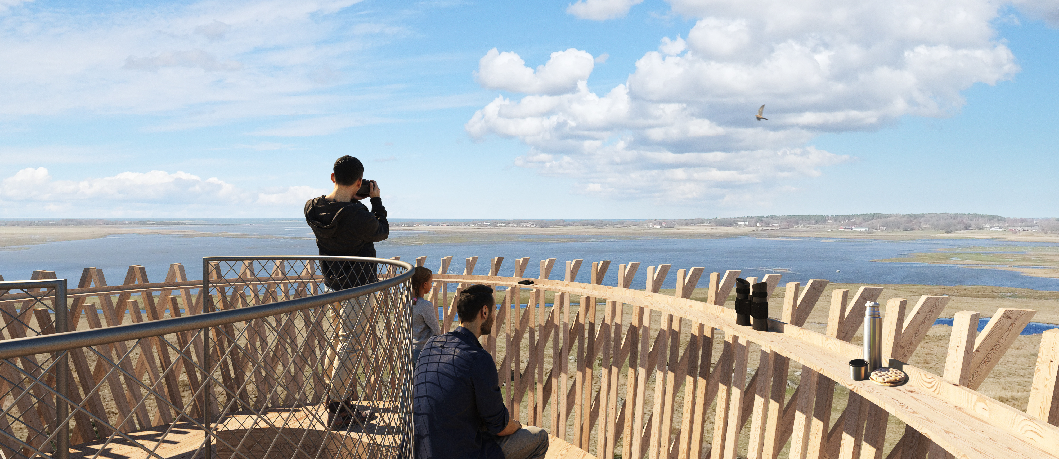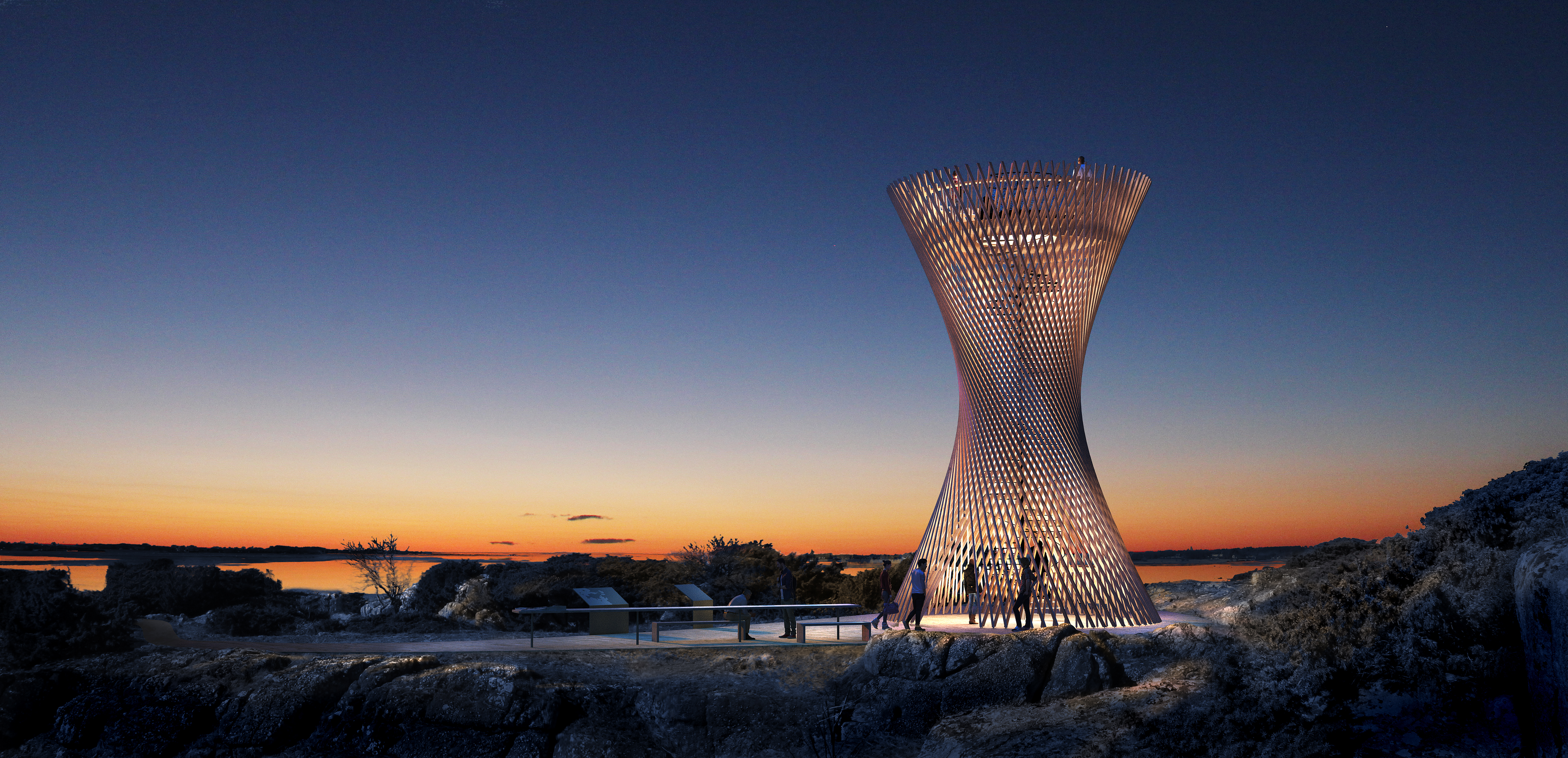 Den spännande utformningen med smala ribbor i trä, som består av 140 stycken 13 meter långa reglar som fogas samman i en tät flätstruktur, är ritad av White Arkitekter. En spiraltrappa ska leda upp till övre planet som har utsikt åt alla håll.