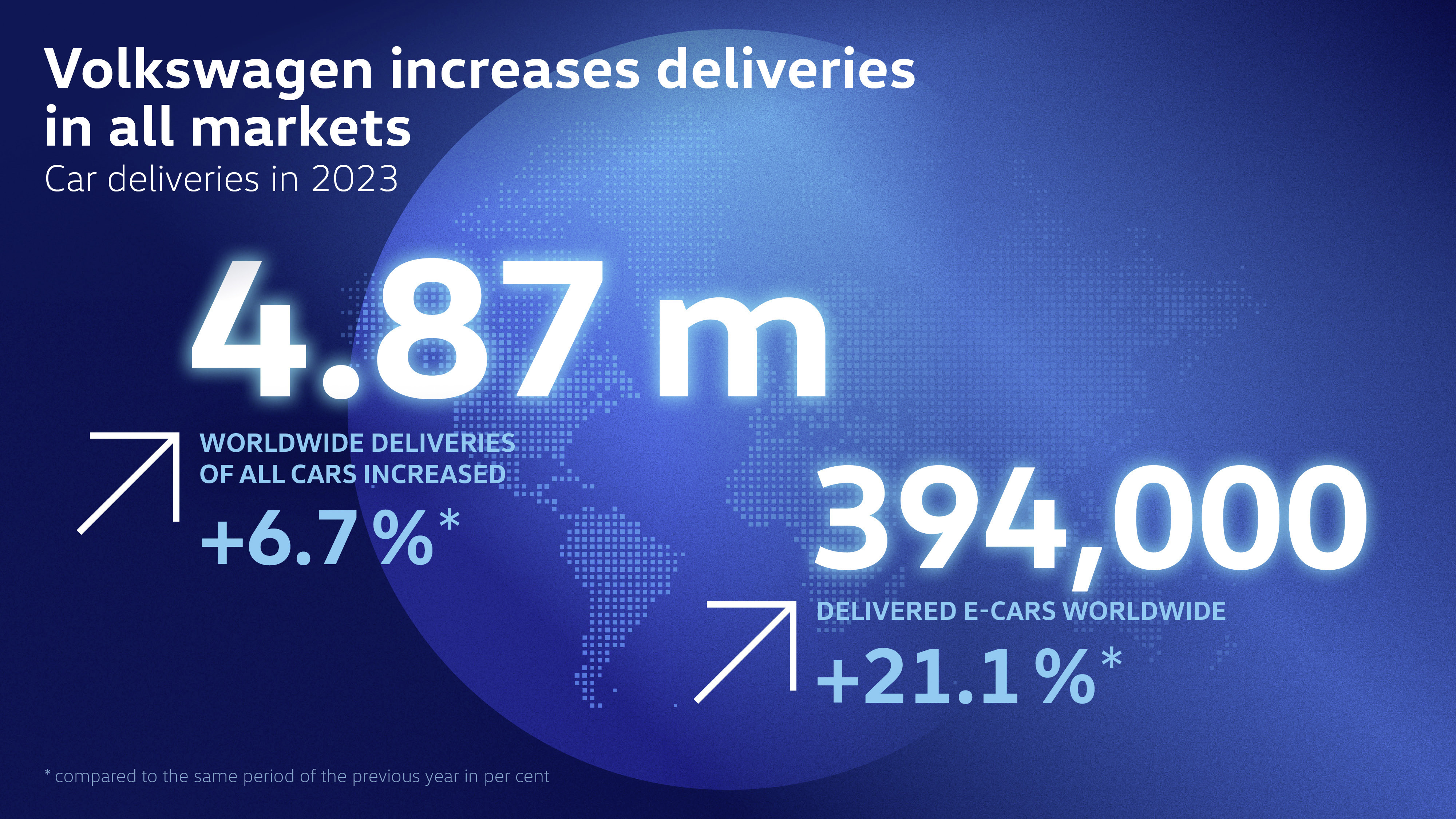 Märket Volkswagen ökade sina leveranser med 6,7 procent förra året, då cirka 4,87 miljoner bilar överlämnades till kunder över hela världen. Siffrorna överträffade föregående års siffror i alla regioner. Efterfrågan på eldrift ökade också. Under 2023 överlämnade Volkswagen cirka 394 000 helt eldrivna bilar, vilket motsvarar en ökning med 21,1 procent jämfört med föregående år.