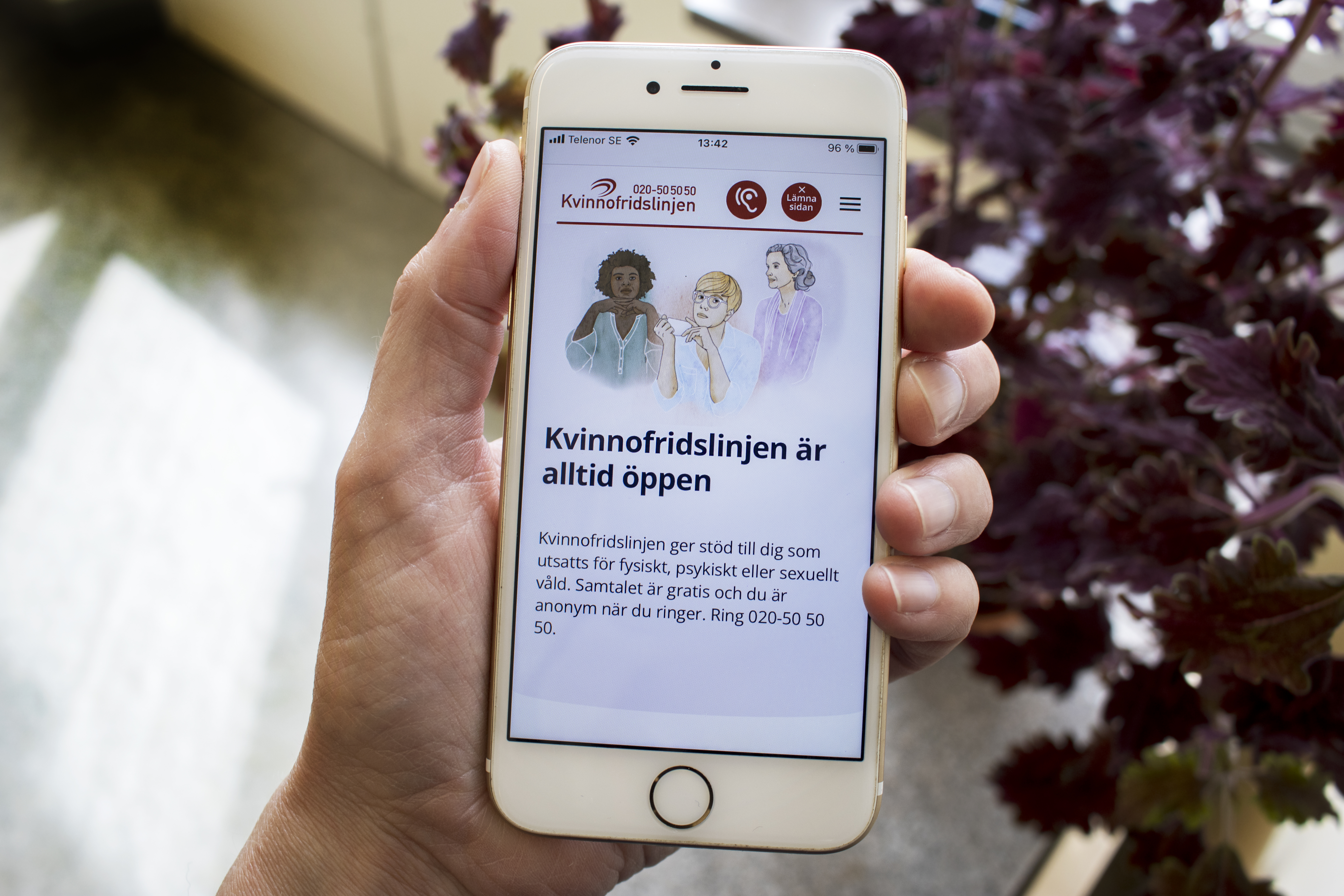 - Kvinnofridslinjen 020-50 50 50 är Sveriges nationella stödtelefon för den som utsatts för hot, våld eller sexuella övergrepp. Anhöriga och vänner är också välkomna att ringa. Även personal inom till exempel hälso- och sjukvård och socialtjänst som möter våldsutsatta kan ringa för att få stöd och rådgivning.