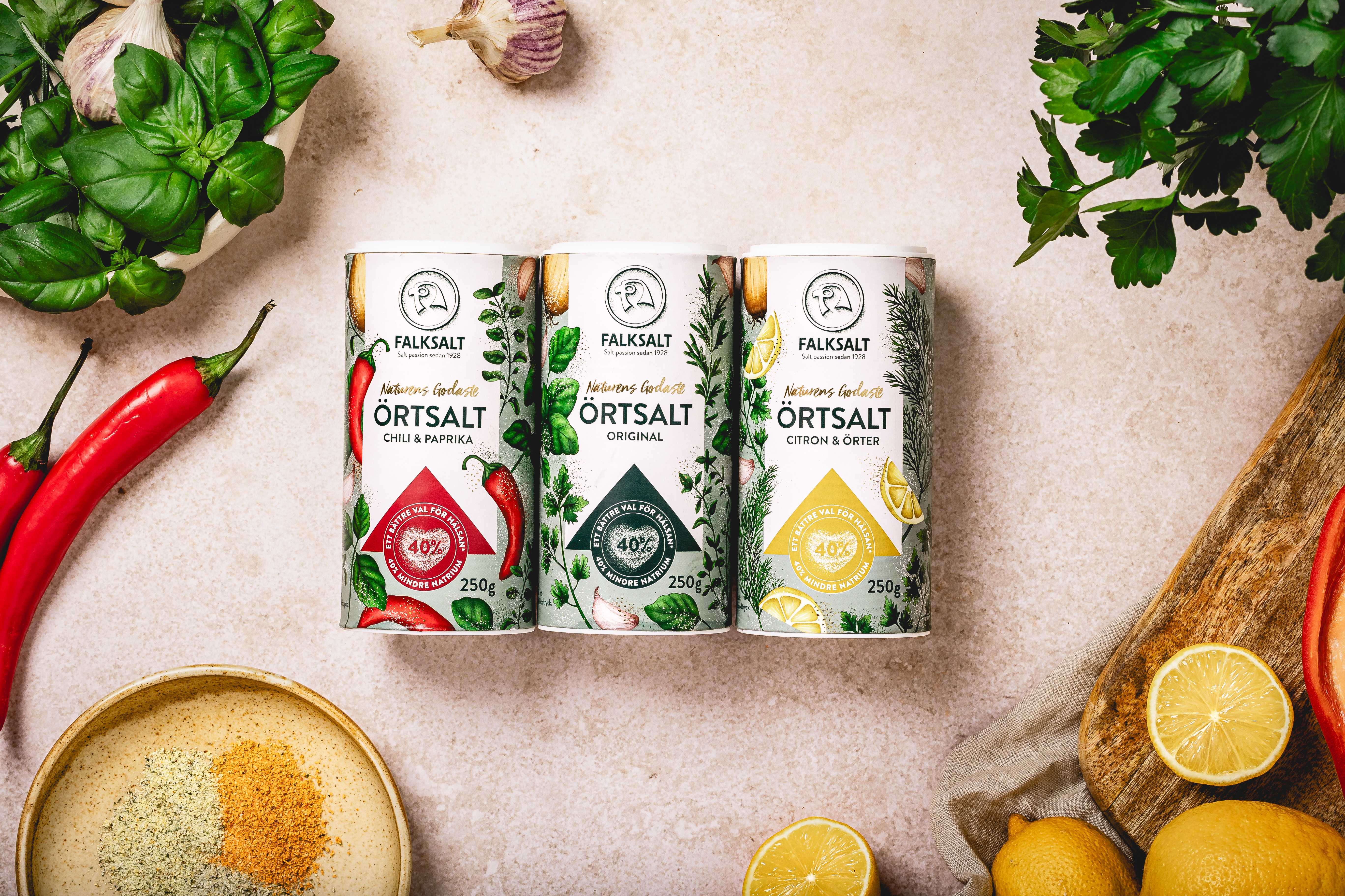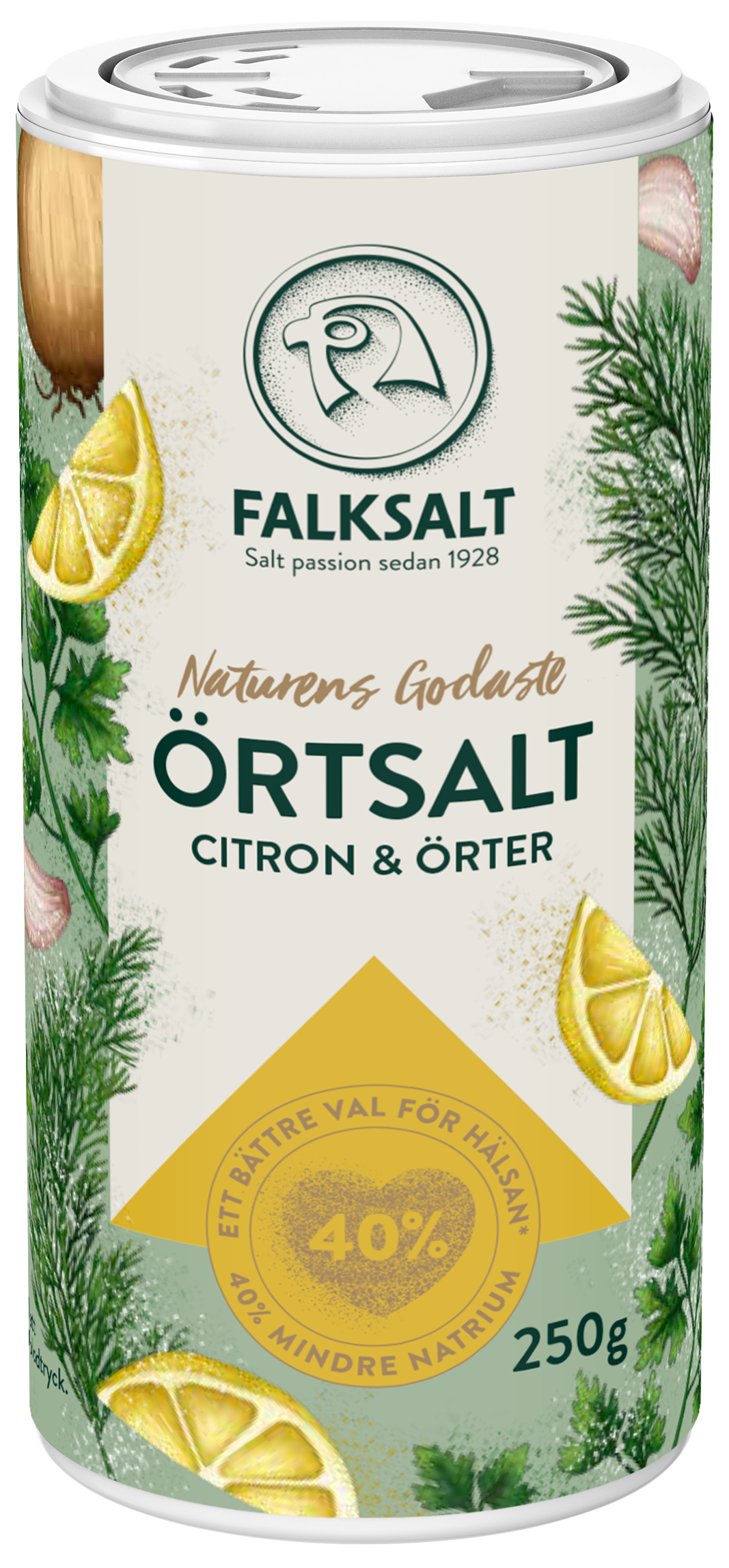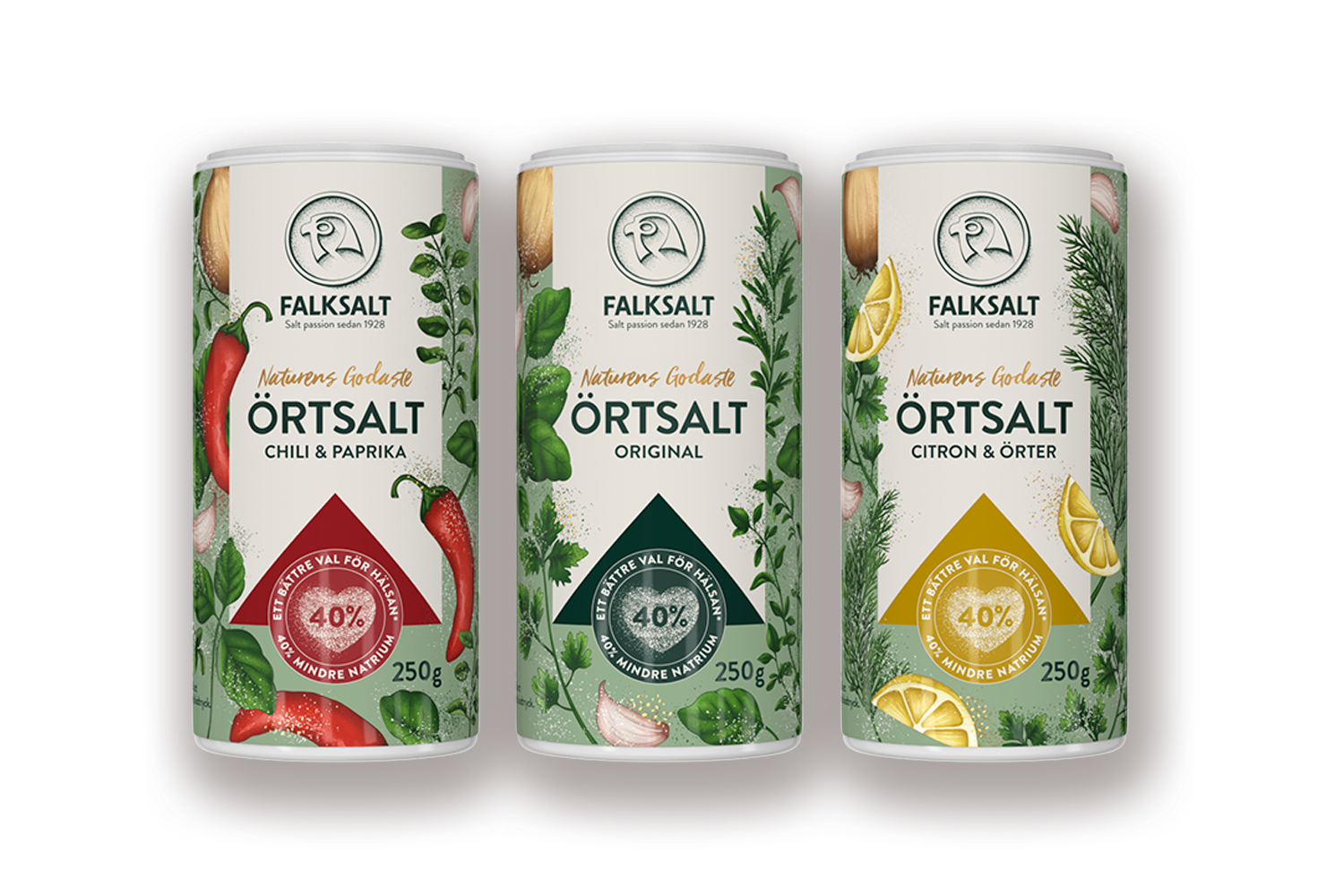 I samarbete med naturen presenterar Falksalt sin senaste nyhet, Naturens Godaste Örtsalt. Ett örtsalt som är fyllt med örter och smaksättare från växtriket och som kommer i tre smakkombinationer – klassiska Original, uppfriskande Citron & Örter samt en kryddig touch av Chili & Paprika. Dessutom är de helt unika eftersom de, helt naturligt, innehåller 40 procent mindre natrium än vanligt bordssalt. Ett gott val för hälsan, och för smaken!