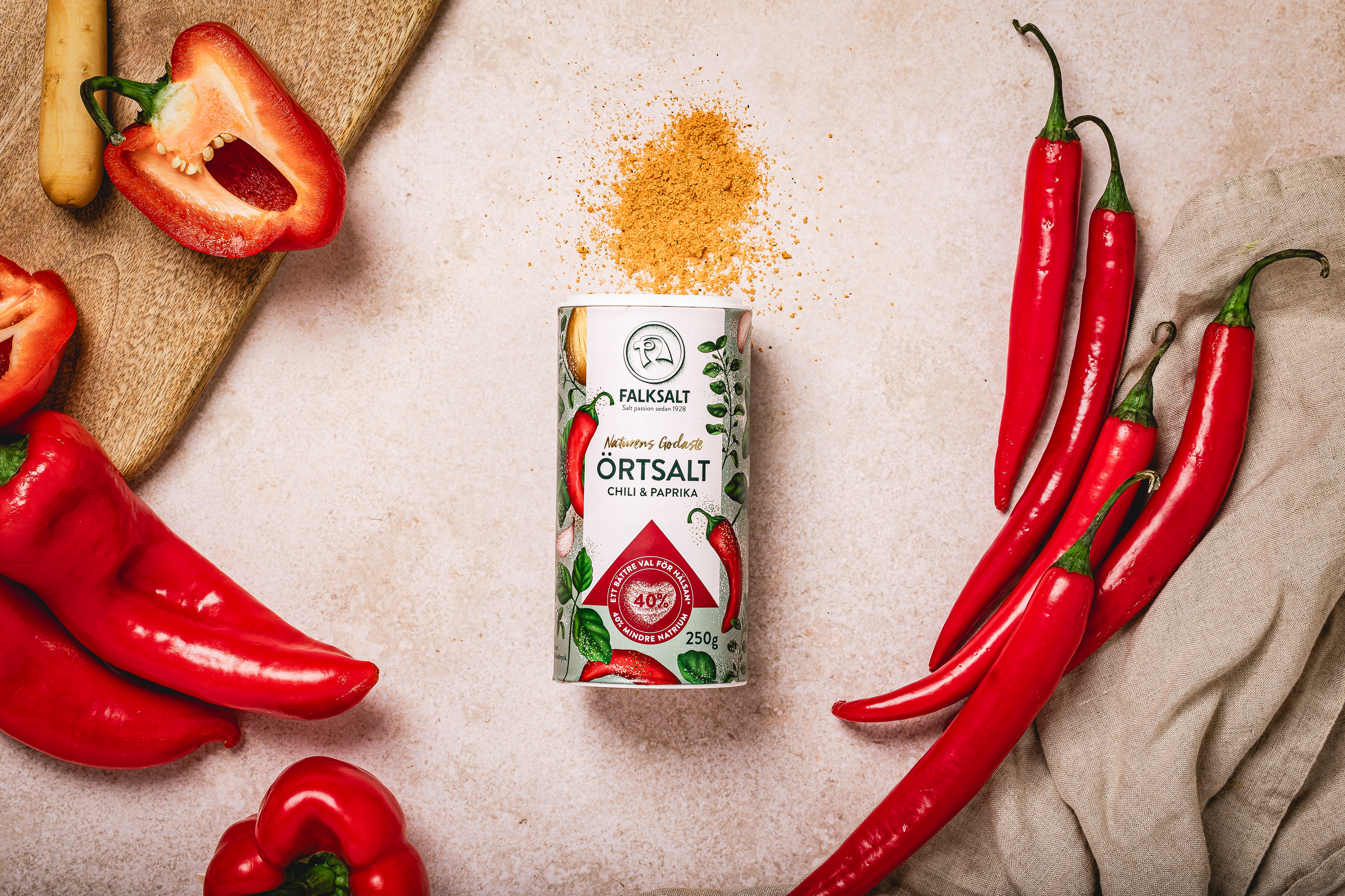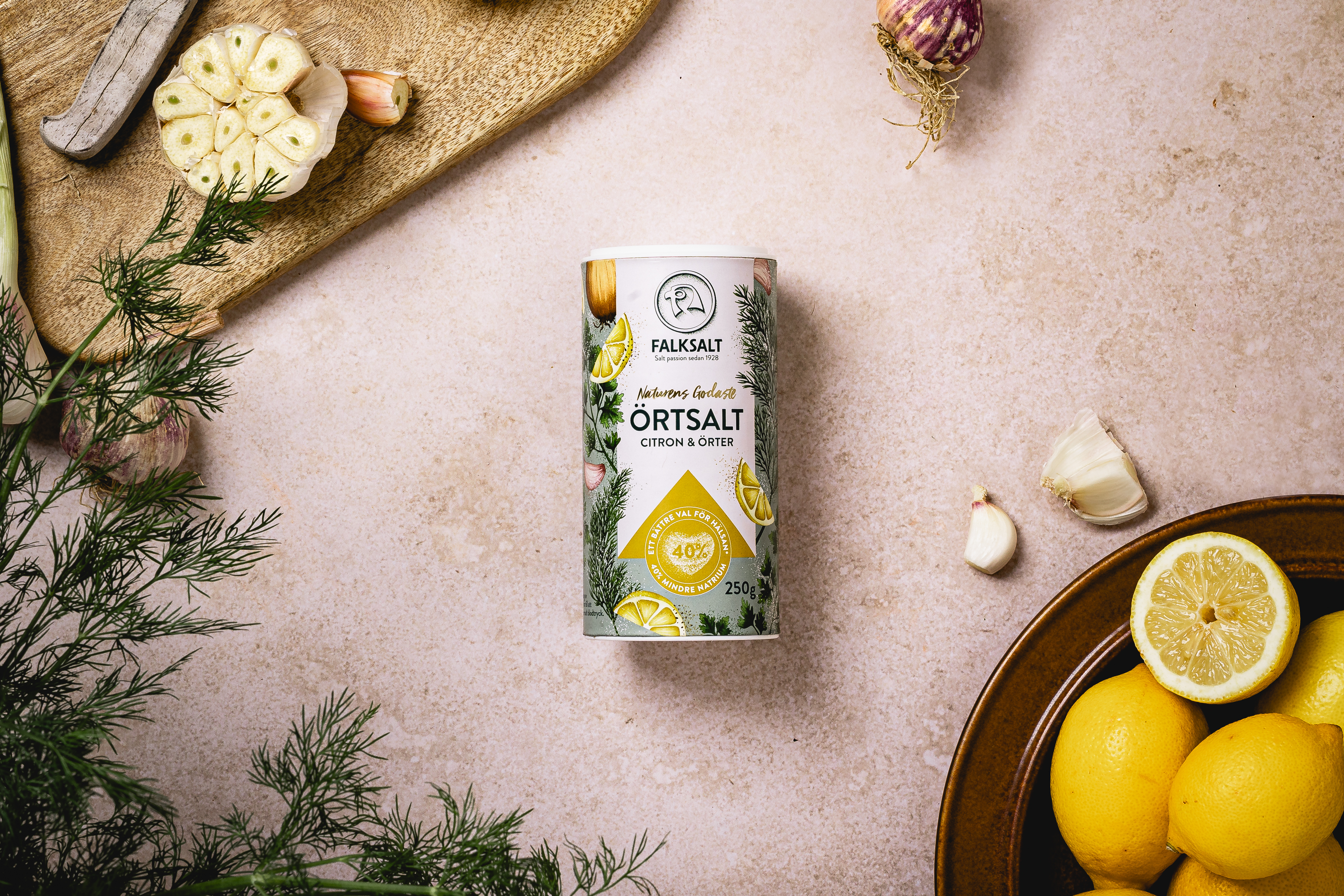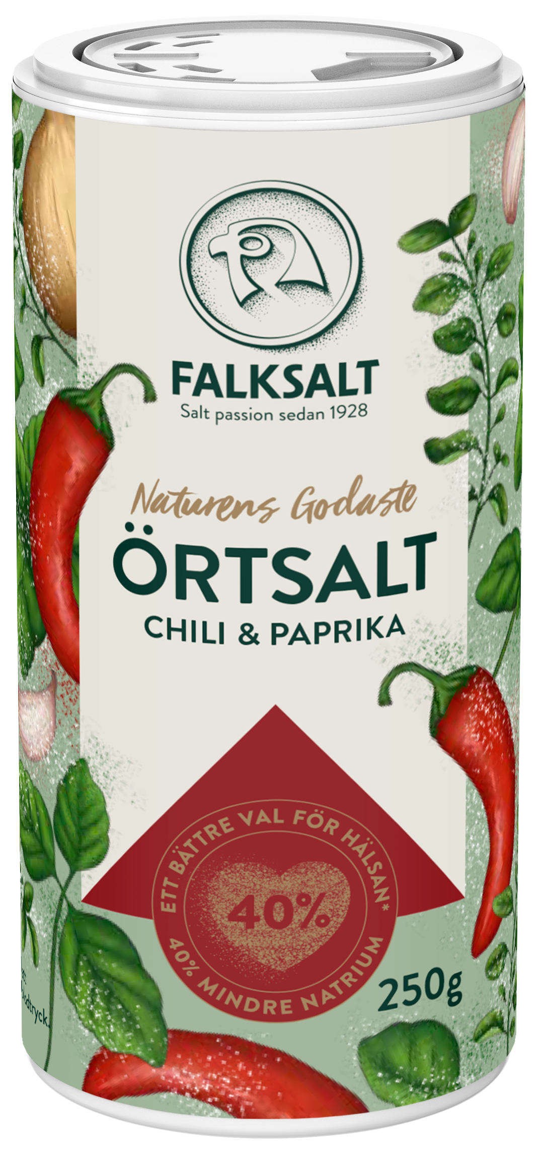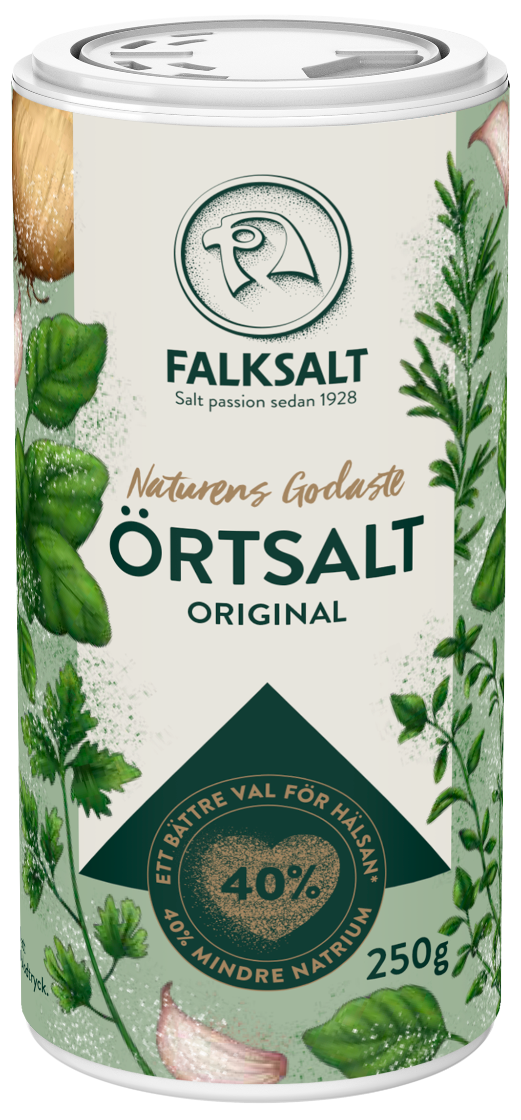 I samarbete med naturen presenterar Falksalt sin senaste nyhet, Naturens Godaste Örtsalt. Ett örtsalt som är fyllt med örter och smaksättare från växtriket och som kommer i tre smakkombinationer – klassiska Original, uppfriskande Citron & Örter samt en kryddig touch av Chili & Paprika. Dessutom är de helt unika eftersom de, helt naturligt, innehåller 40 procent mindre natrium än vanligt bordssalt. Ett gott val för hälsan, och för smaken!