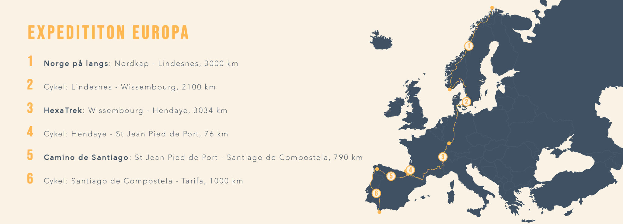 Under äventyret vill Linda dessutom göra vad hon själv kallar en “Europeisk Tripple Crown”, en variant på den nordamerikanska vandringsutmaningen med samma namn. För hennes del innebär det att förutom Norge på langs även att vandra den franska leden HexaTrek (3034km) och den klassiska pilgrimsleden Camino de Santiago (ca 800 km). De tre lederna och kontinentens ytterpunkter länkas ihop med cykel, då sträckan ska ske helt för egen maskin.