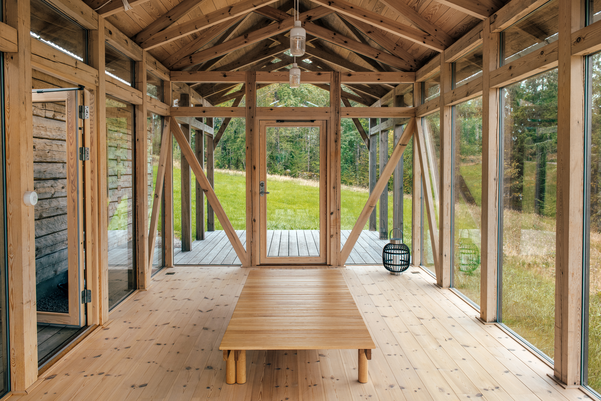 Vägen kröker sig svagt genom skogen. Plötsligt öppnar sig landskapet som sluttar sig ned mot en vacker sjö. Där i fonden på krönet står ett timmerhus från vår tid. En modern parstuga i vackra proportioner. Parallellt med ett släpp på en halvmeter mot denna slutna byggnad står en lätt uppglasad byggnad med synlig trästomme. Kompositionen är genial. Att som i detta projekt sammanfoga kända konstruktionsprinciper på ett nytt sätt, vrida på proportioner och våga vara enkel visar på möjligheten att också ett litet projekt blir stor arkitektur.