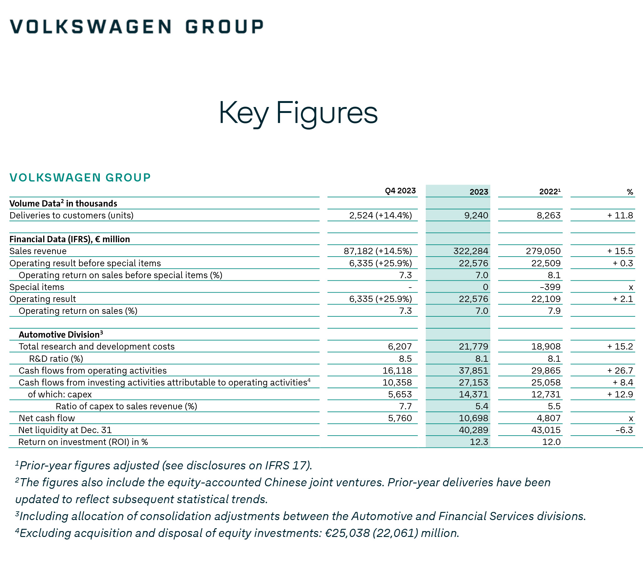 - Arno Antlitz, CFO & COO för Volkswagen Group: "Resultatet för räkenskapsåret 2023 visar att vi har blivit ännu mer stabila. Vi har utmärkta produkter och har lanserat ambitiösa effektivitetsprogram för hela koncernen. Därför har vi tilltro till 2024, trots dämpade ekonomiska utsikter och intensiv konkurrens."