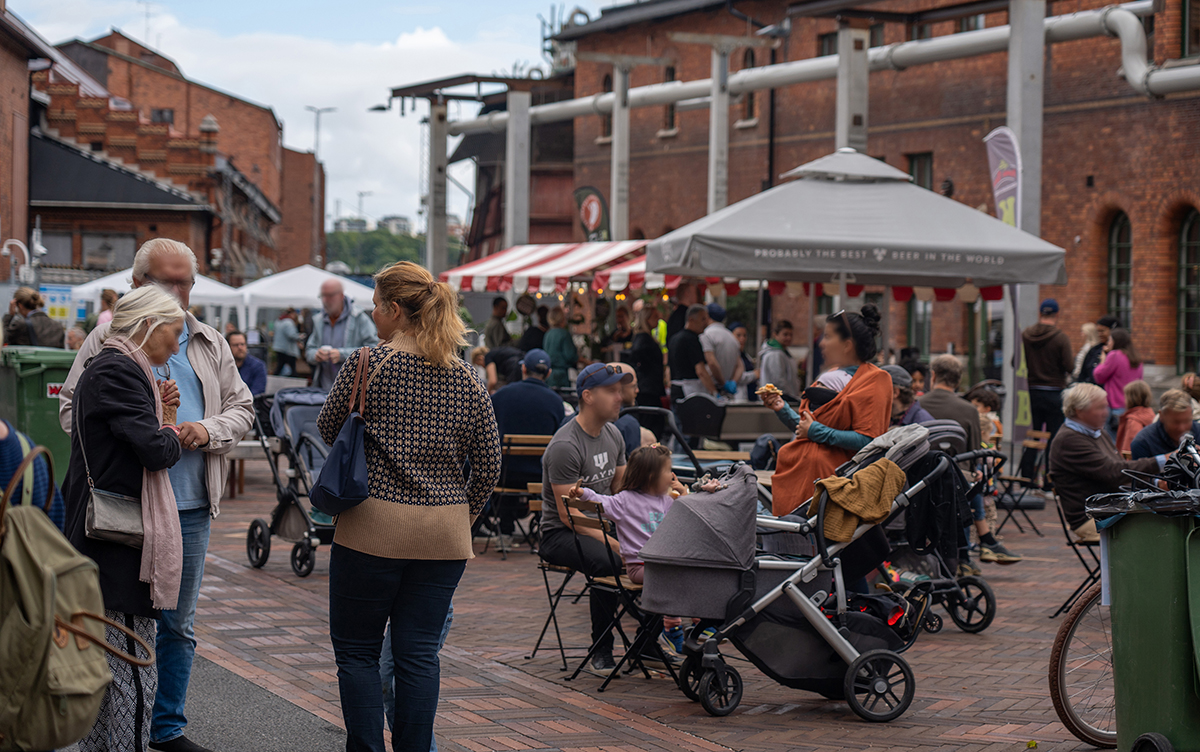 Bobergstorget ligger mellan varsamt renoverade byggnader med restauranger, museum, skolor och service och torget binder samman gatorna och gränderna i Gasverket som omformas till stadskvarter.