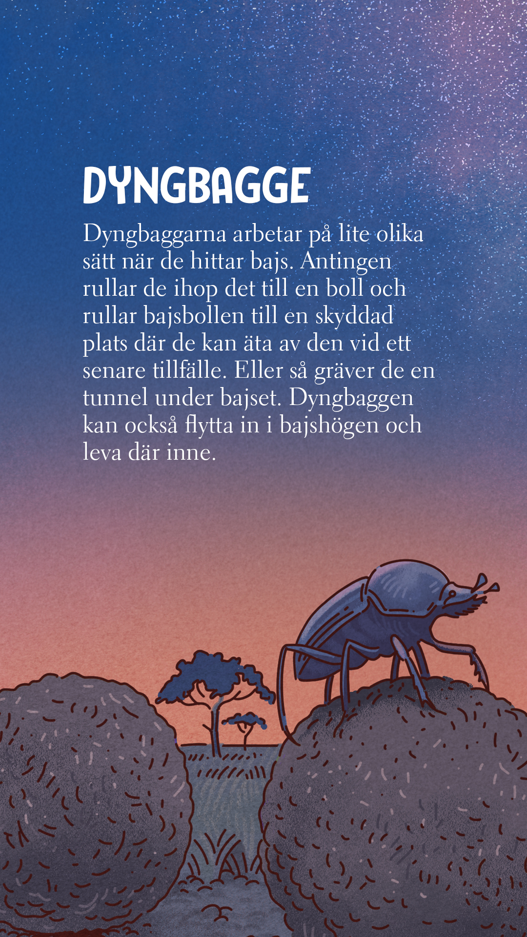 I ”Djuren bajsar” träffar du på alla möjliga arter – från giganter som kaskelottvalar och noshörningar, till betydligt mindre djur som daggmaskar och dyngbaggar. Tanken är att det både ska dyka upp djur som barn känner igen samtidigt som de ska få lära sig om mindre kända arter.