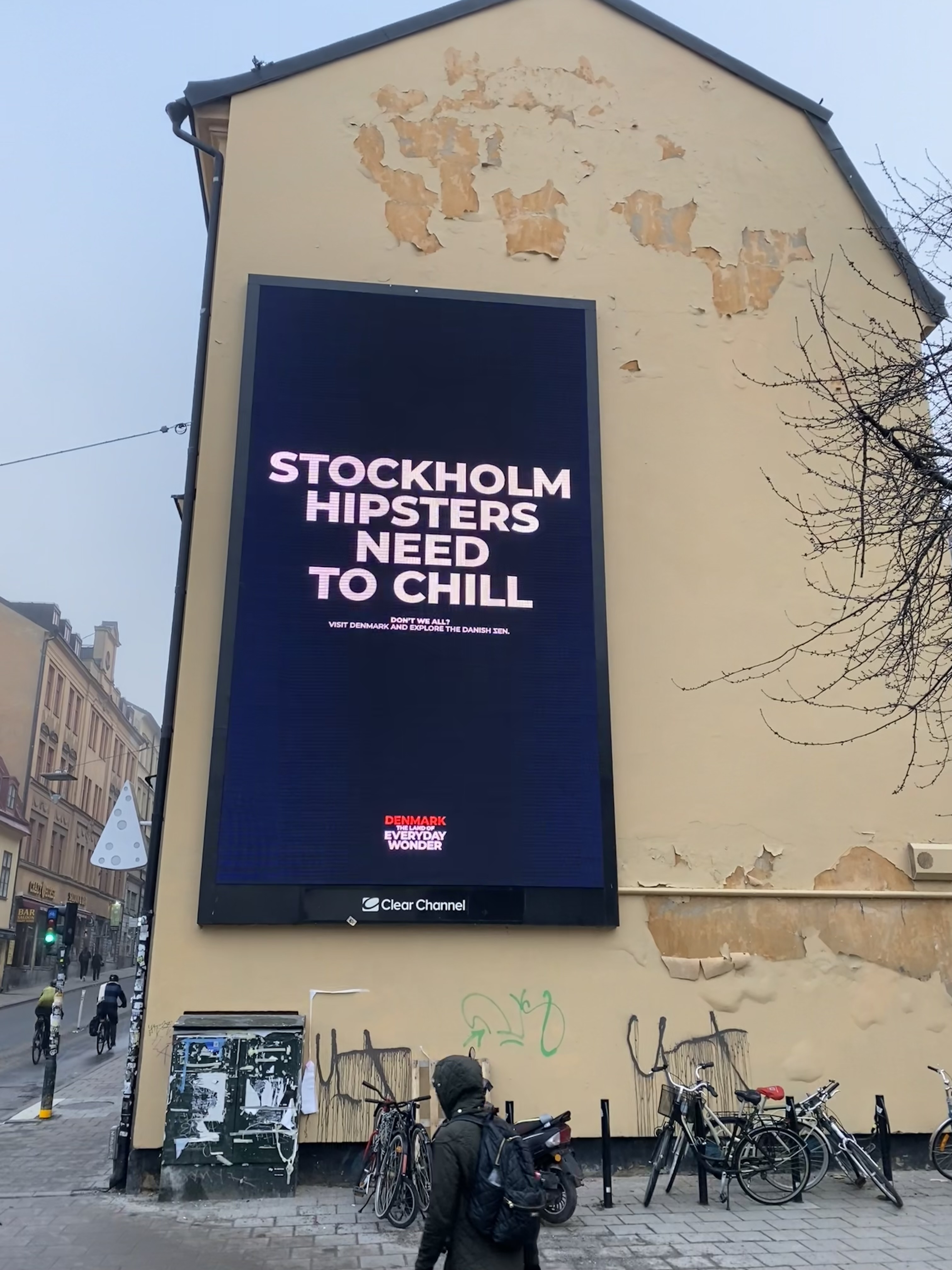 Med en stor reklamskylt på Medborgarplatsen i Stockholm uppmanar Danmark alla Stockholms hipsters att ”chilla”. Samtidigt rullas en kampanj ut i sociala medier med en video där ”The Danish Zen” presenteras. Danskarnas unika förmåga att säga strunt samma, låta saker passera och deras avslappnade förhållningssätt till livet marknadsförs nu som "The Danish Zen" - och som en bra anledning att semestra i Danmark. Bakom kampanjen står den danska turistorganisationen VisitDenmark.