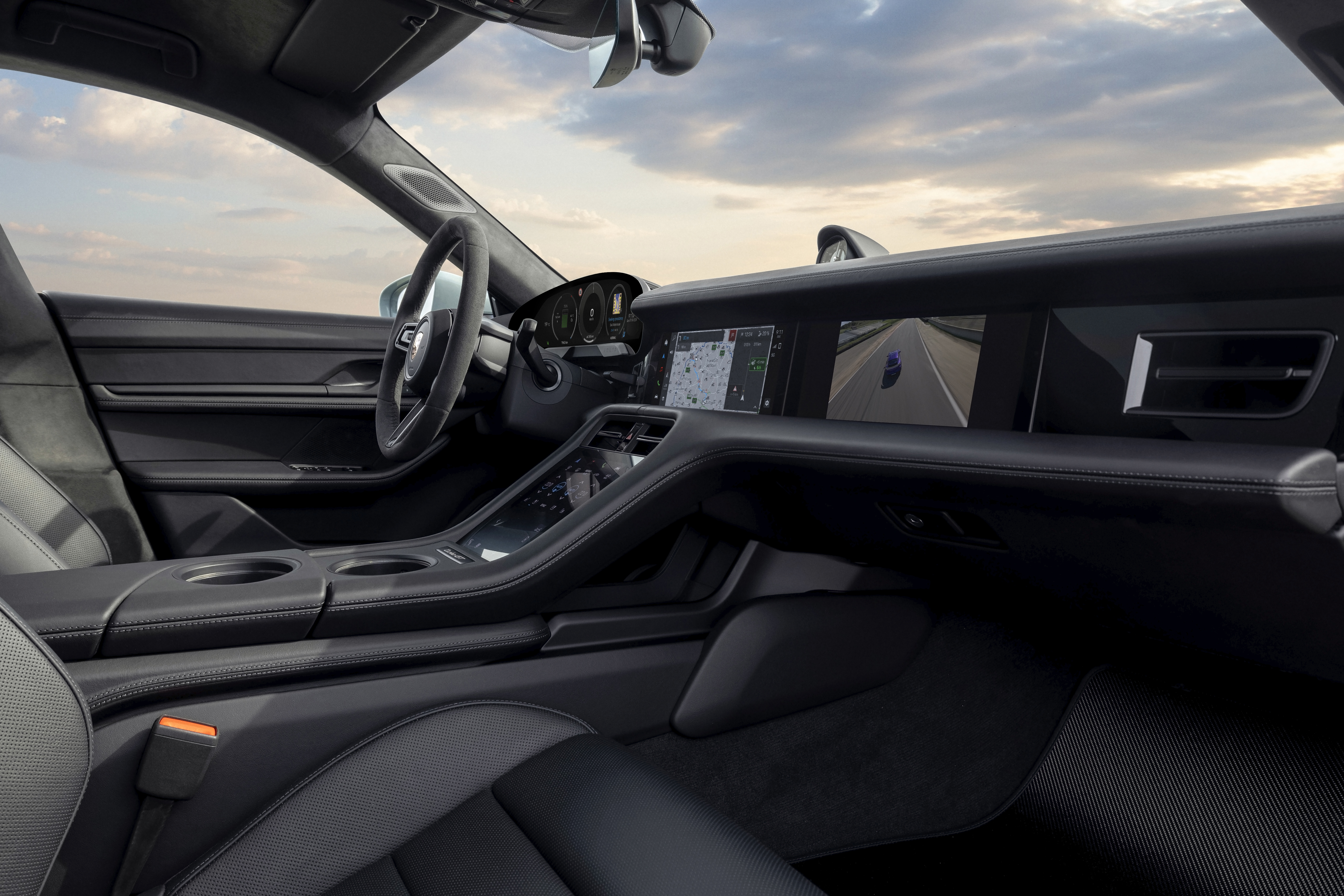 GT-sportratten är klädd med svart Race-Tex och har en klockan-12-markering. Taycan Turbo GT har Sport Chrono-paketet från Taycan Turbo S.