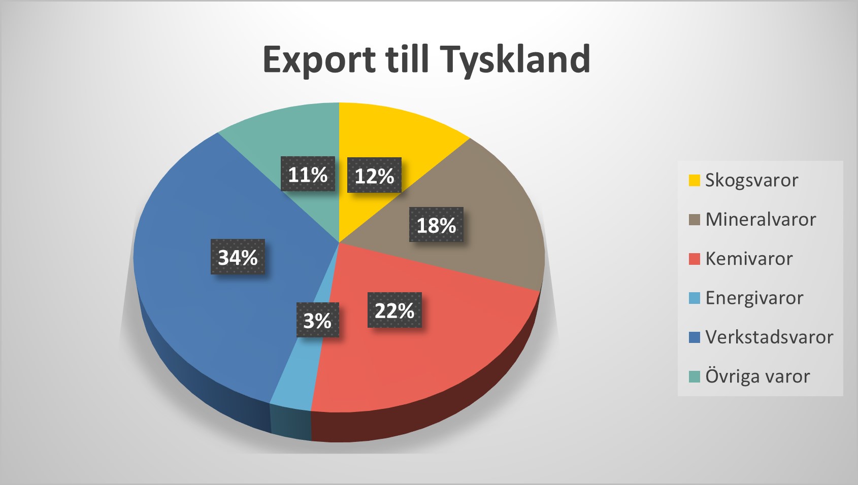 Nästan tre fjärdedelar av Sveriges varuexport går till Europa. Sett till enskilda länder är Norge och Tyskland sedan flera år de två största varuexportmarknaderna. Under fjolåret ökade den totala handelsvolymen av varor med Tyskland med runt åtta procent i jämförelse med 2022 och uppgick till 562,5 miljarder kronor.