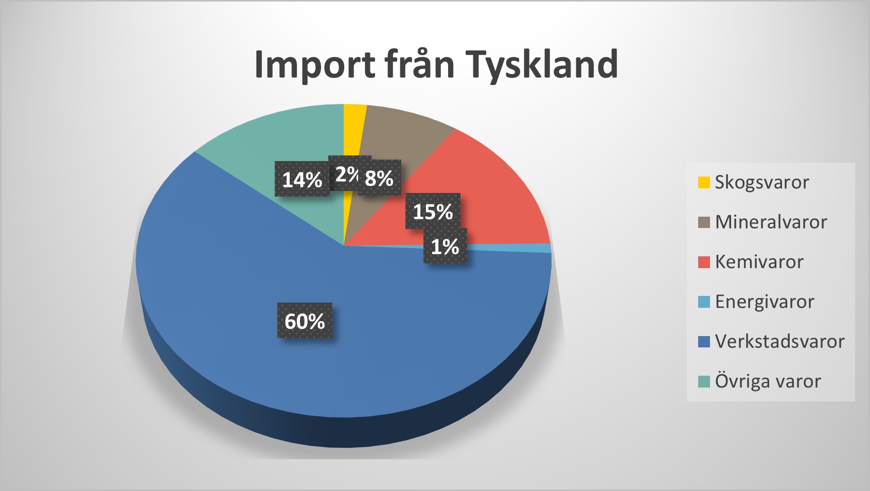 Sett till Sveriges import från Tyskland går också verkstadsvaror absolut starkast. Uppgången ligger på 15 procent och kategorin, som förutom vägfordon innefattar bland annat biltillbehör och telekommunikation, utgör hela 60 procent av den totala importen från Tyskland, vilket är en indikator på hur central den tillverkande industrin är för den tysk-svenska handeln. Kategorin kemivaror är mer eller mindre oförändrad, men även här går varugruppen läkemedel mycket starkt, med en uppgång på 28 procent.