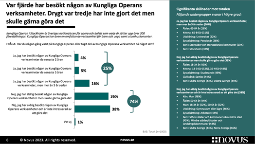 Allt fler vill uppleva balett, opera och klassisk musik på riktigt. En färsk undersökning som NOVUS utfört på uppdrag av Kungliga Operan visar att fler än var tredje av alla dem som ännu inte tagit del av Kungliga Operans verksamhet vill göra det. »Det är fantastiskt att så många vill komma till Kungliga Operan! Vi vill kunna välkomna fler av alla dem som vill besöka oss för första gången. Det här visar att det är hög tid att satsa på Operahuset, vi behöver göra huset mer öppet och tillgängligt och få en permanent andrascen«, säger Kungliga Operans vd Fredrik Lindgren.