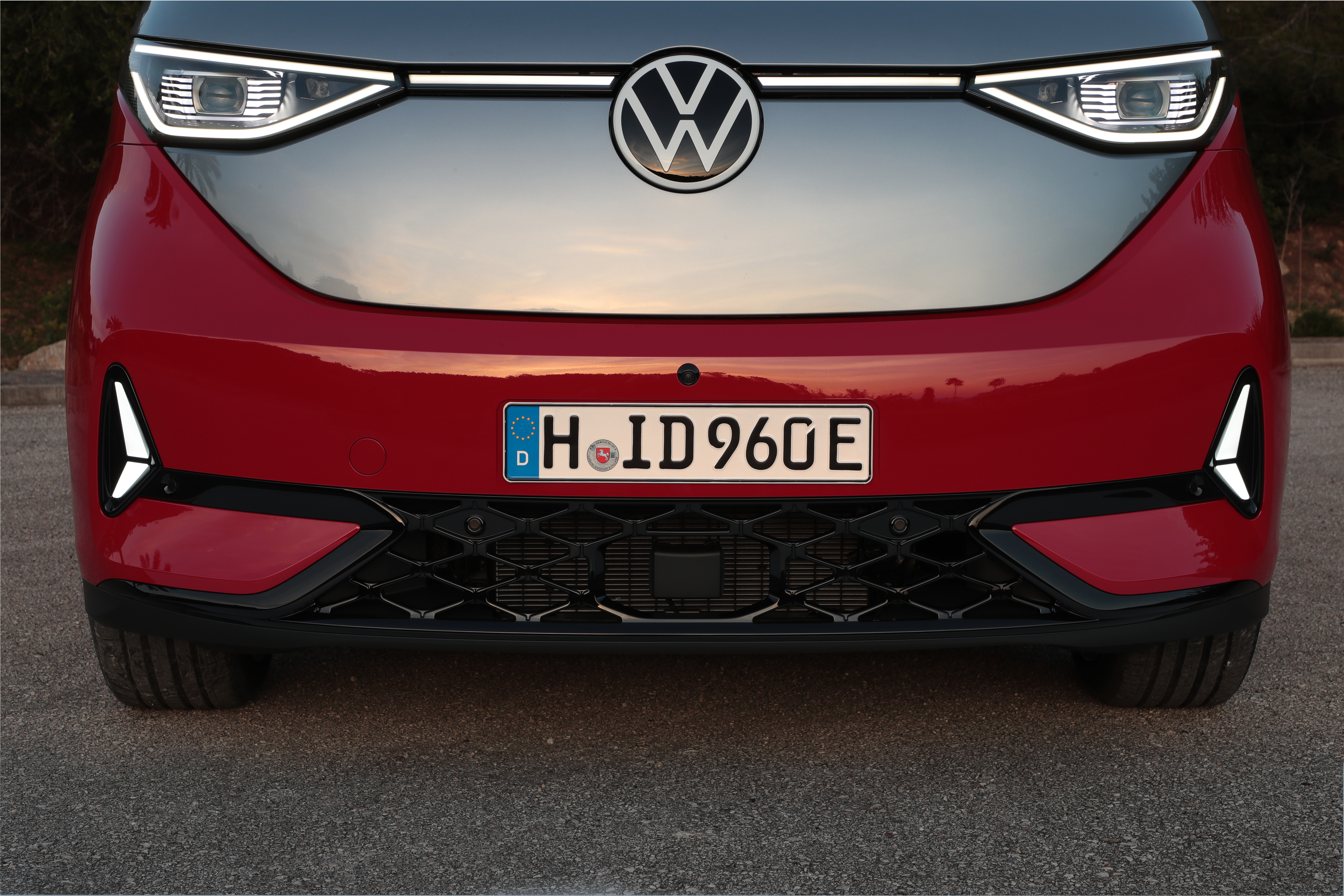 GTX exteriör. ID. Buzz GTX kännetecknas av en unik frontdesign. Stötfångaren i GTX-design med svart luftintagsgaller i bikakemönster och nya luftstyrningselement på sidorna ger bilen ett dynamiskt och distinkt utseende. Det nydesignade varselljuset är integrerat på sidorna av stötfångaren med två LED-trianglar ovanpå varandra i form av ett pilhuvud. Alla karossdetaljer som det nya luftintagsgallret, luftstyrningselementen, GTX-inskriptionen och ytterbackspegelkåporna är svarta i högblankt utförande. Dessutom ingår den nya 19-tums lättmetallfälgen Venlo i ID. Buzz GTX standardutrustning. Utbudet av GTX-fälgar kompletteras av två nya 21-tums lättmetallfälgar med beteckningarna Caracas (svart) och Townsville (svart med diamantslipad yta) och erbjuds som tillval. ID. Buzz GTX levereras med IQ.LIGHT LED-matrix strålkastare som standard.