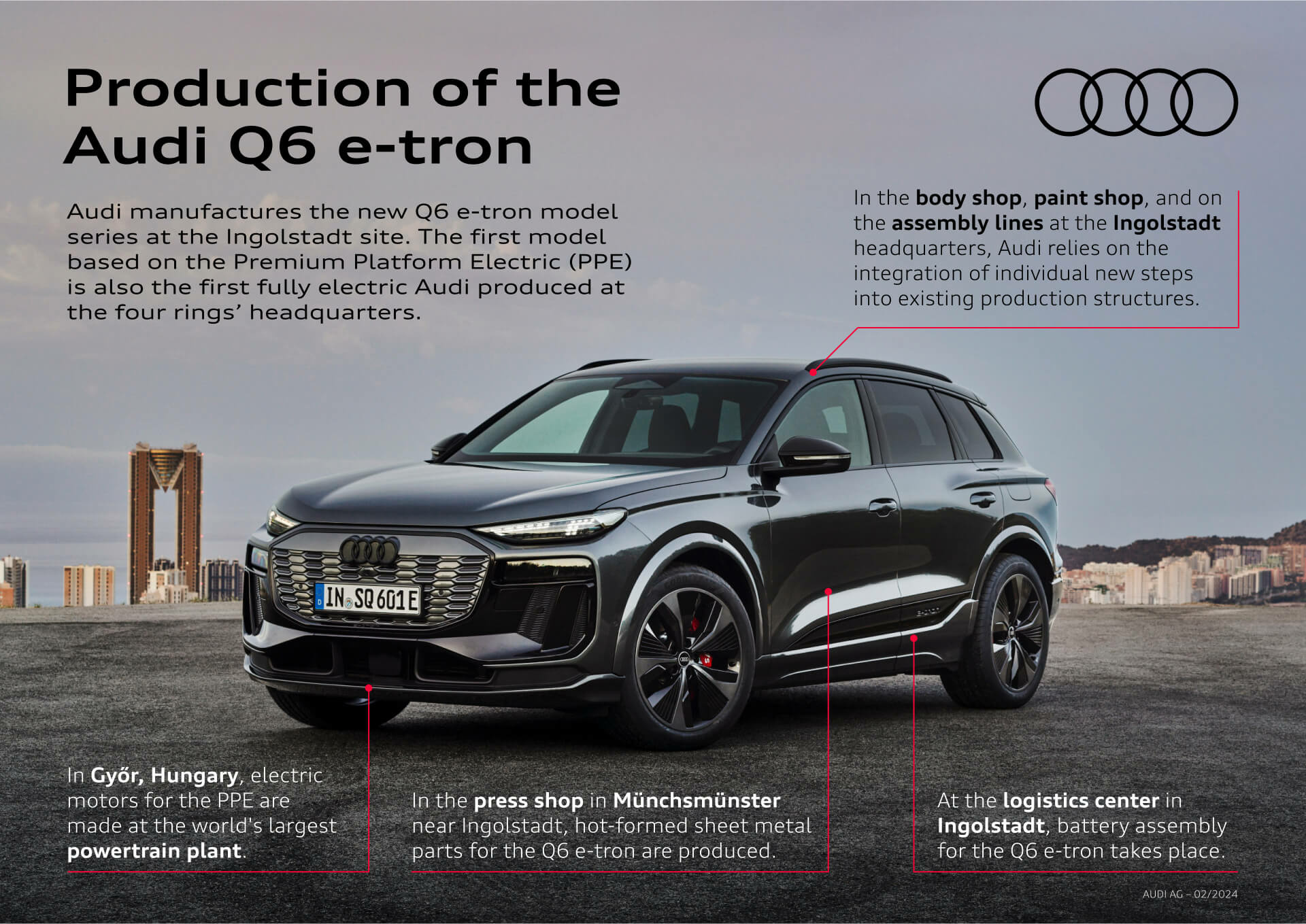Audi Q6 e-tron är den första helelektriska modellserien som Audi tillverkar vid huvudkontoret i Ingolstadt. I linje med märkets produktionsstrategi 360factory har Audi integrerat produktionen i redan befintliga strukturer och processer. Sedan den 1 januari 2024 är Ingolstadt också den tredje Audi-anläggningen med nettonollutsläpp1, efter Bryssel (2018) och Győr (2020). Ingolstadt är dessutom den första Audi-anläggningen i Tyskland med eget batterimontage.