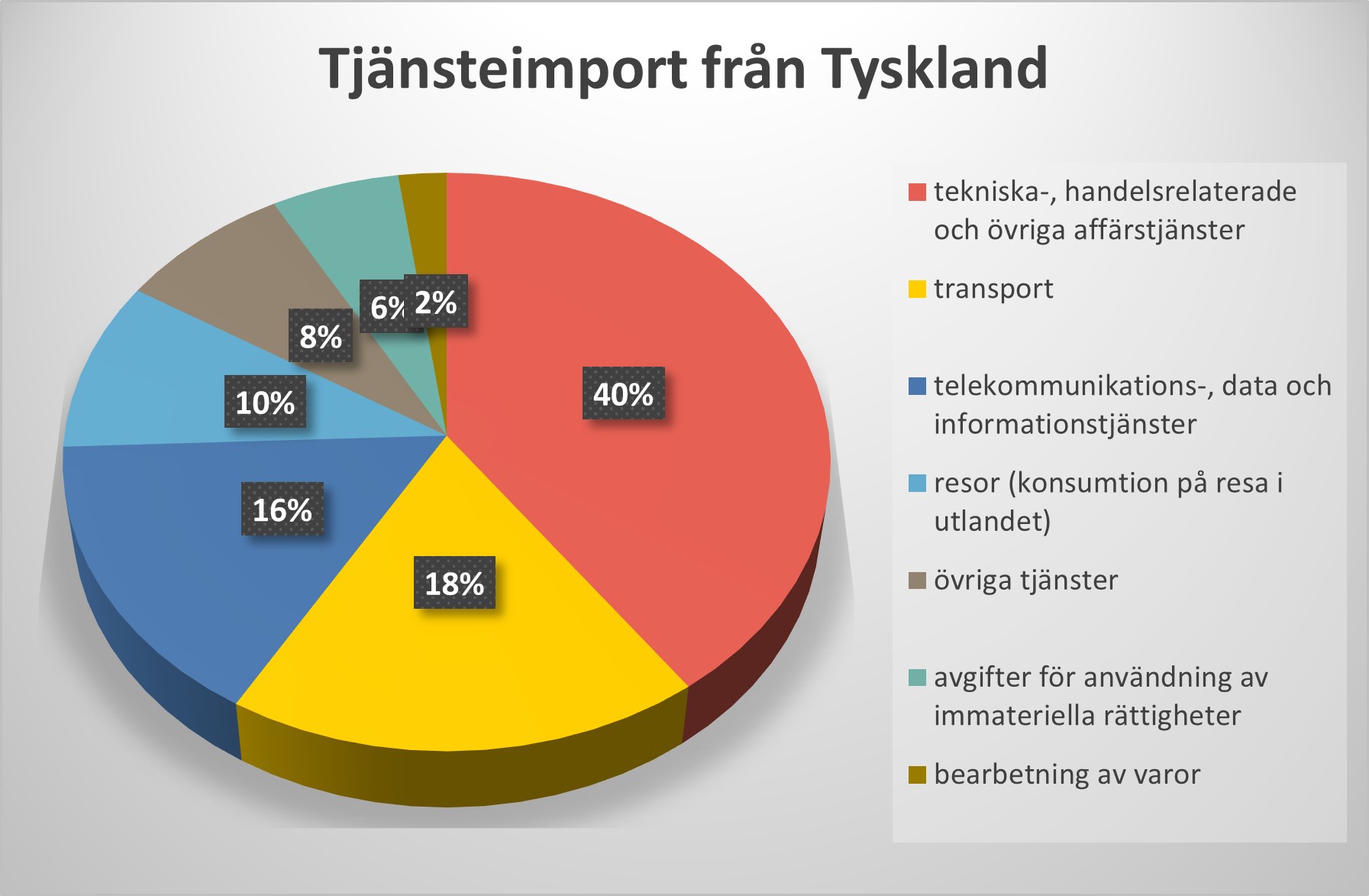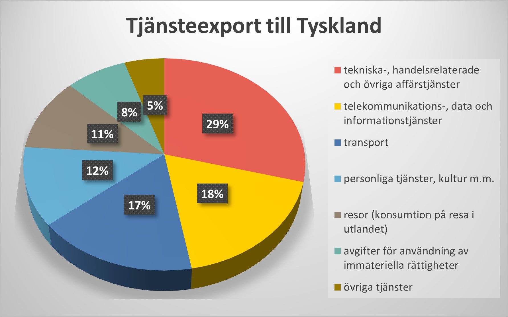 Tyskland är Sveriges största handelspartner för export och import av varor. Men sett enbart till tjänstehandeln placerar sig Tyskland på fjärde plats på listan bland Sveriges största exportländer och på tredje plats för import av tjänster.