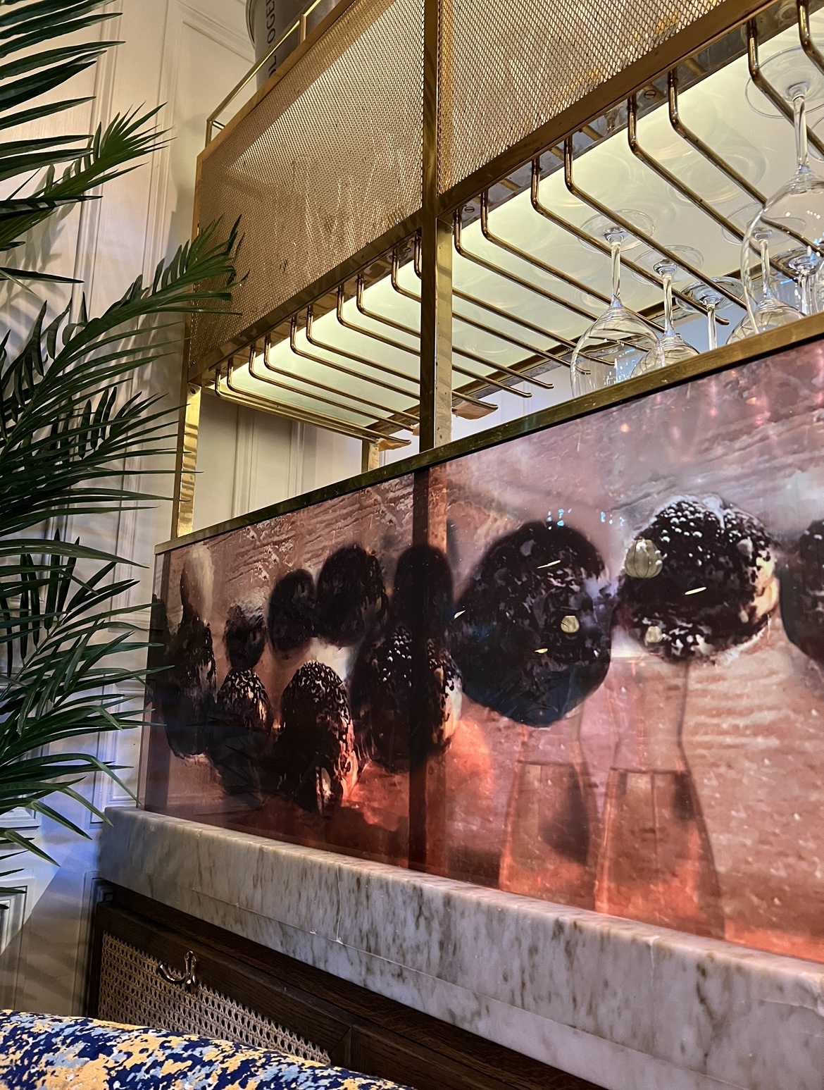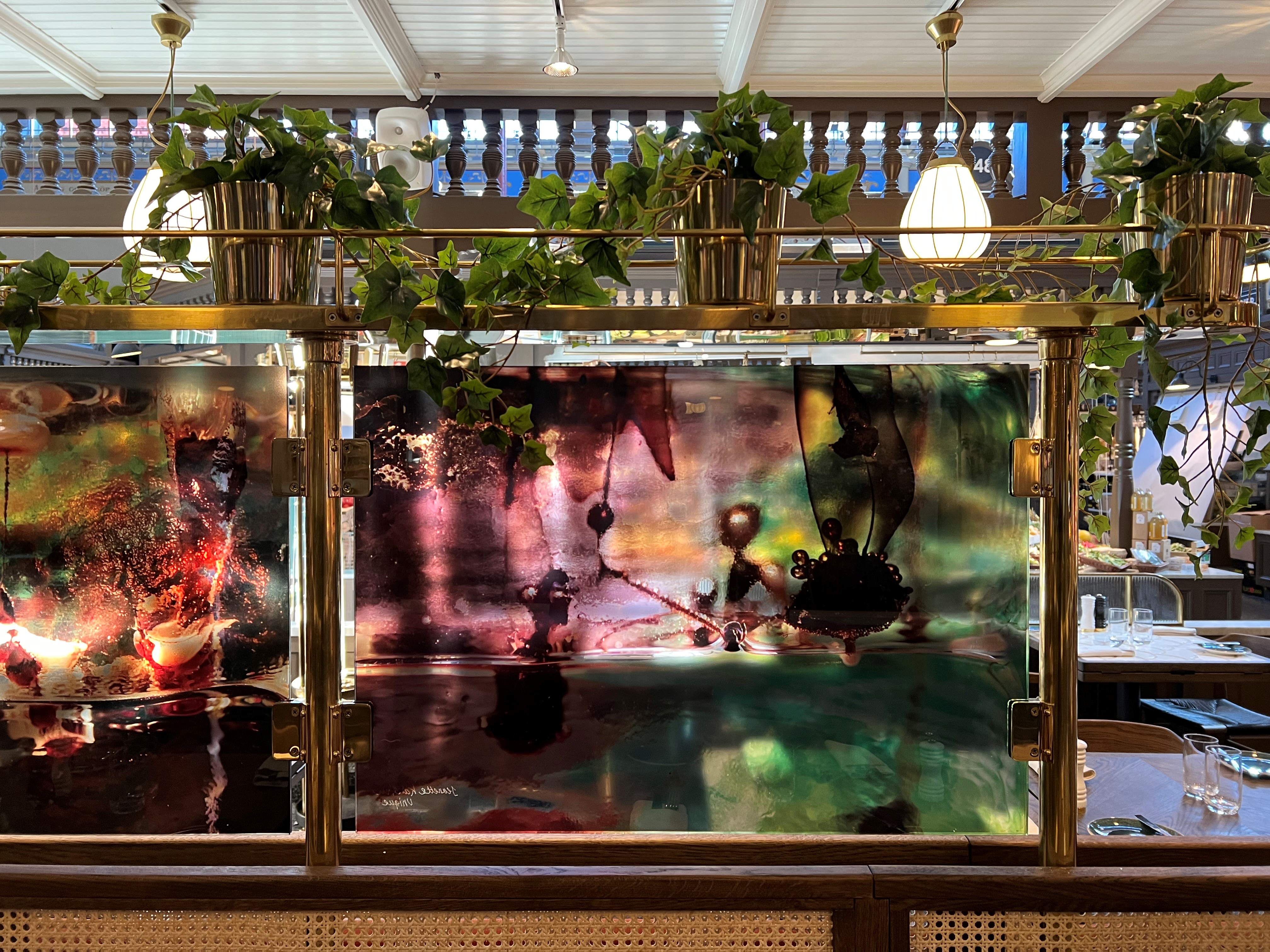 – Utmaningen för mig var att jag planerade och genomförde hela projektet, en restaurang utan väggar, själv i minsta detalj, både svårt och roligt. Så jag har skapat en identitet för restaurangen med hjälp av femton olika konstverk med härdade laminerade glas infattade i mässing. Glaslaminaten försetts med fotografier av konstglas med olika ljusbrytningar, skiftningar och projektioner. De pärlemorskimrande motiven är hämtade från havet med association till snäckor, fiskar och skaldjur, beskriver Jeanette Karsten och hyllar arbetet av Printglas som tryckt bilderna på glaset och laminerat det hela.