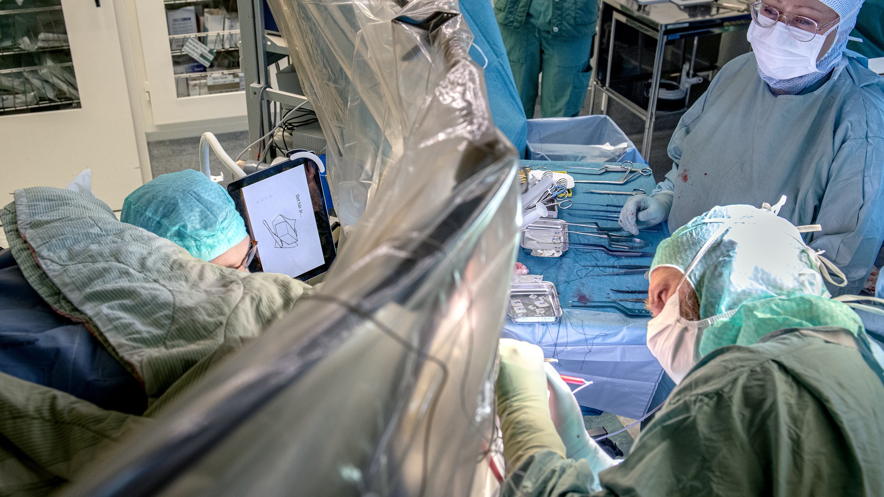 På en skärm i en operationssal dyker nya bilder upp framför patienten som får svara på vad den ser. Det kan se ut som en enkel övning men en del av patientens skallben är avlägsnat och hjärnan syns tydligt i det skarpa ljuset.