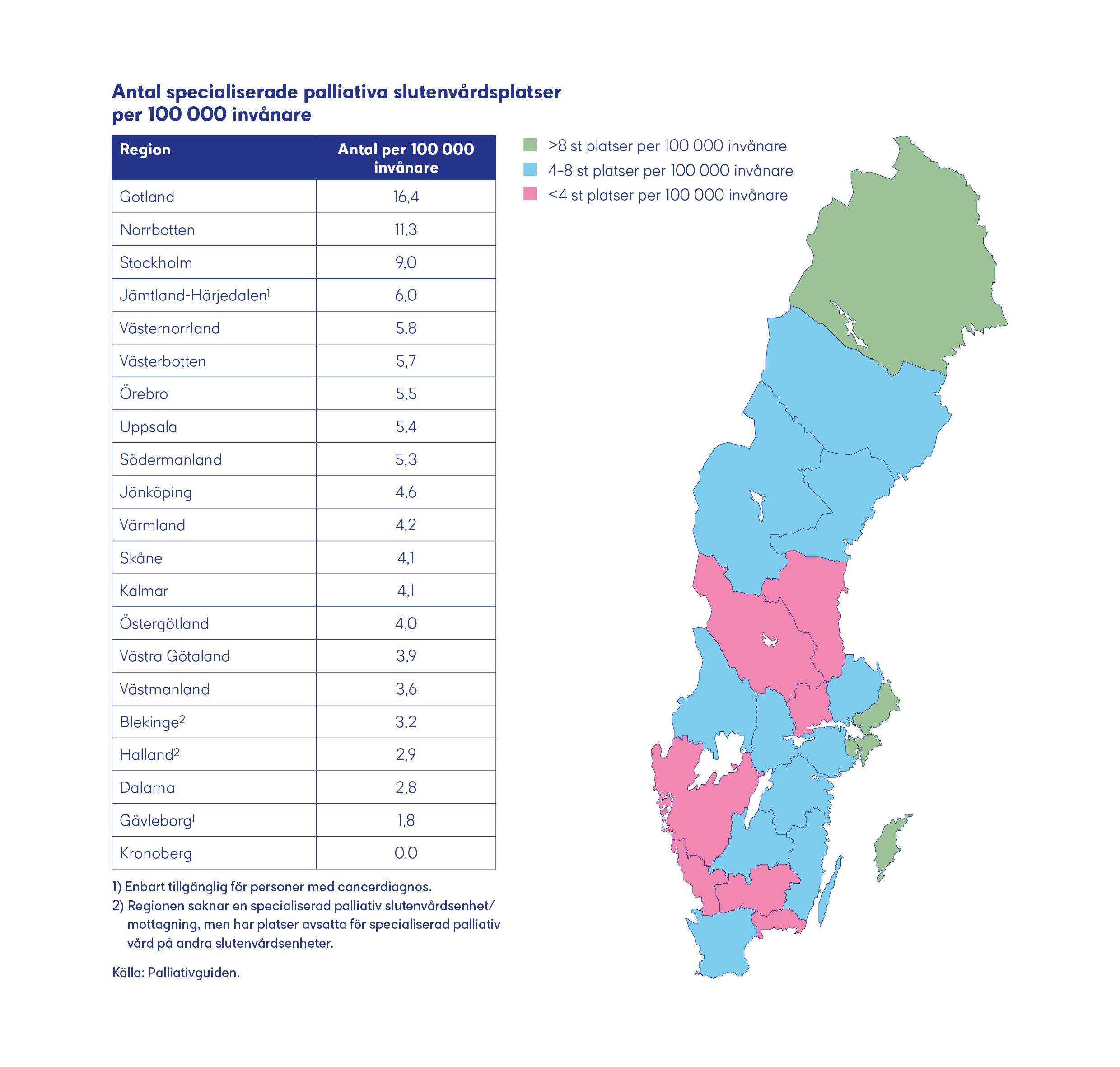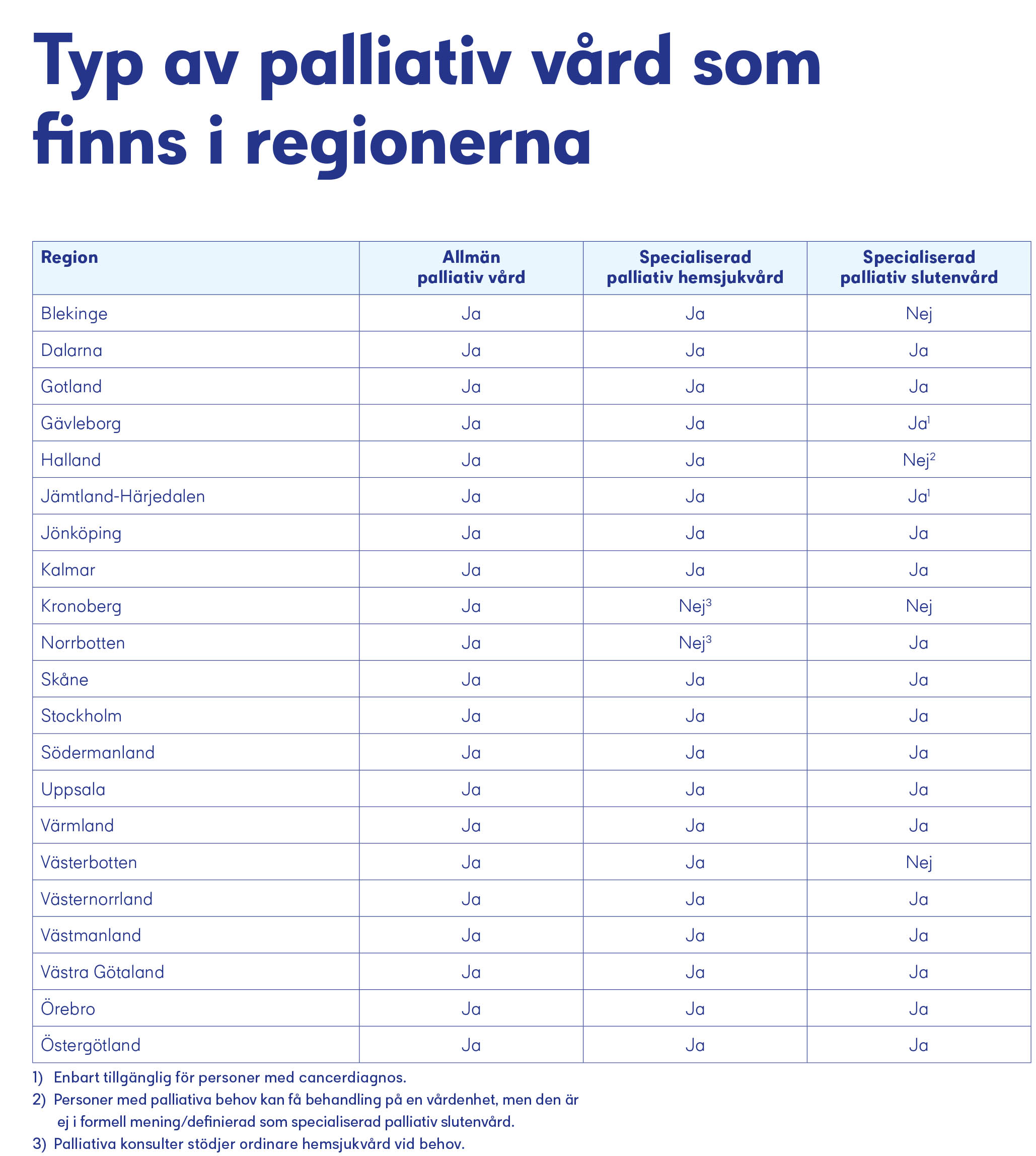 Cancerfondens kartläggning visar att den palliativa vården idag saknar gemensam riktning och mål. I stället bygger den palliativa vården till stor del på individuella eldsjälar i vården. De patienter som får palliativ vård, och även deras närstående, är ofta mycket nöjda. Men det är tydligt att det finns skillnader både mellan och inom regioner när det gäller tillgången till olika former av palliativ vård och i vilken utsträckning patienter får ta del av den. En läkare uttrycker det som att det kan liknas vid ett lotteri där patientens bostadsadress är avgörande för hur tillgången till palliativ vård ser ut.