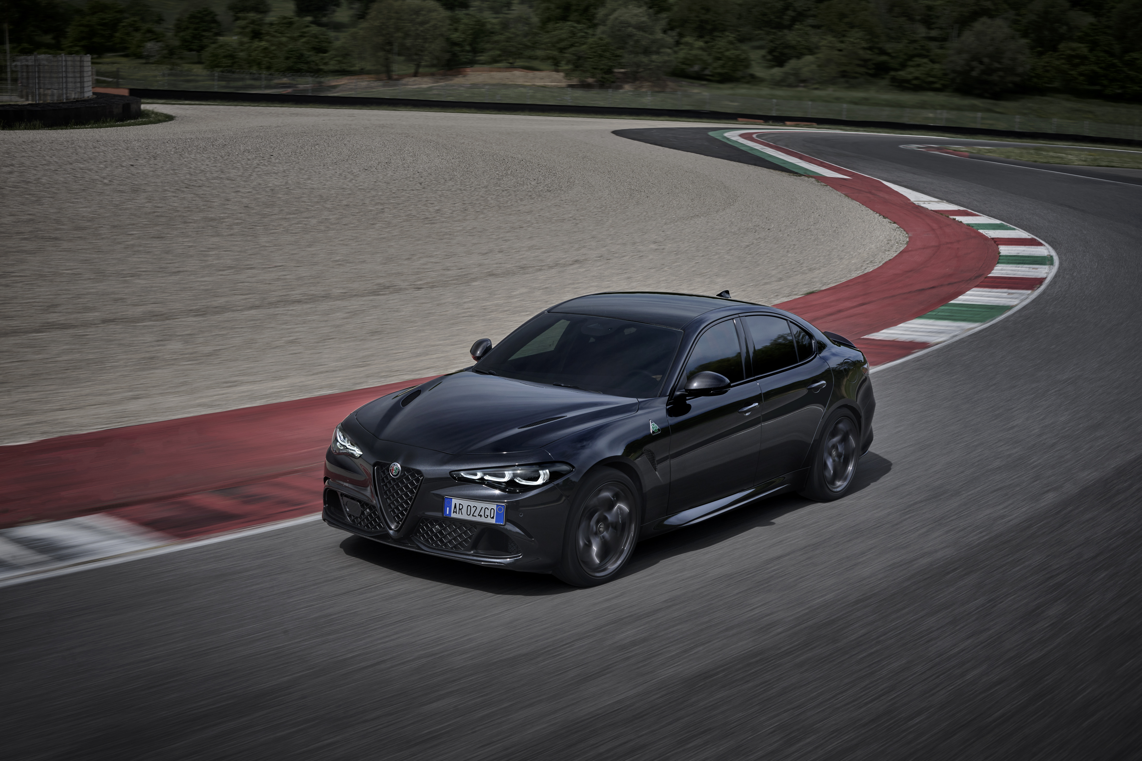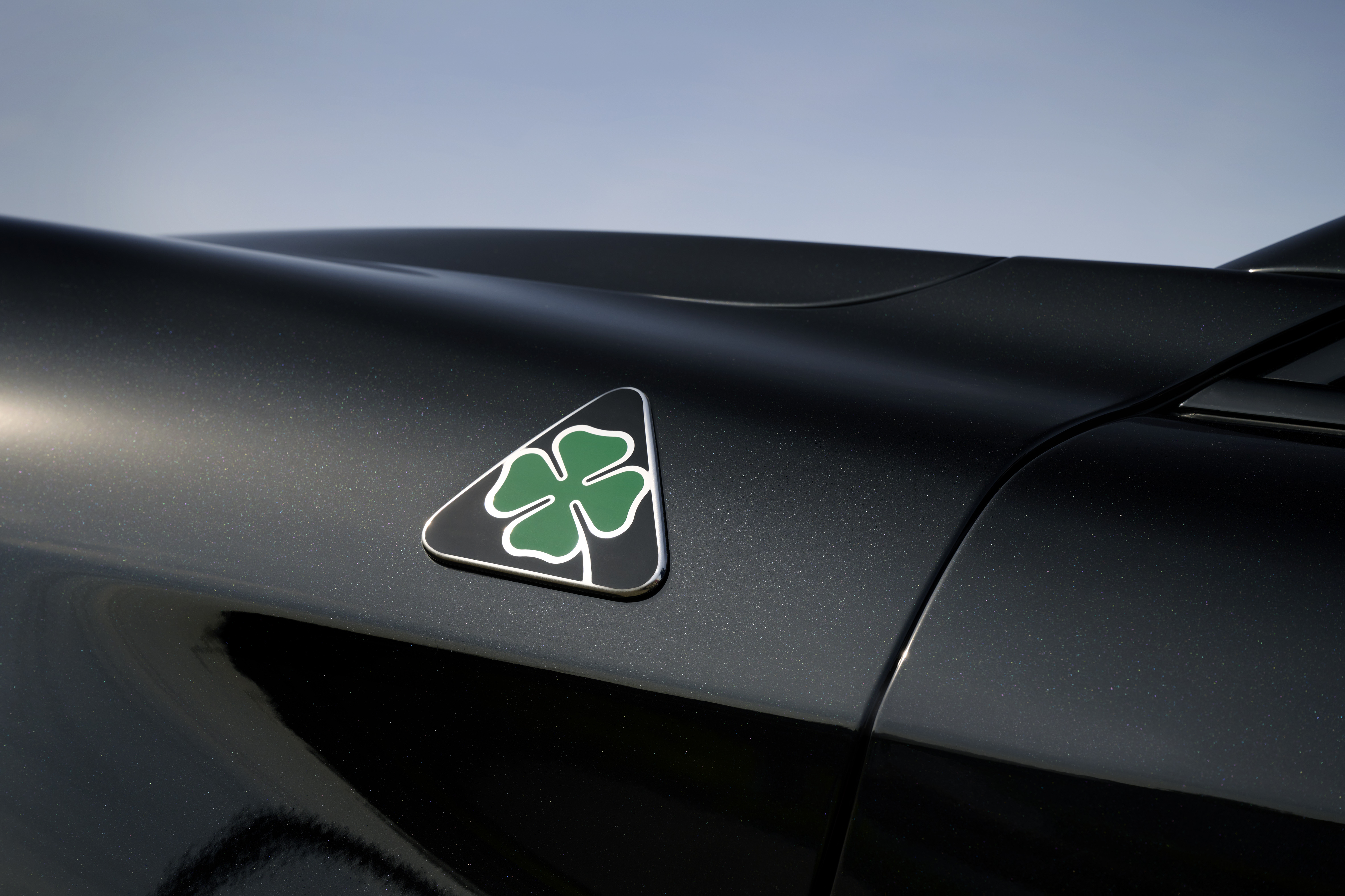 För att skapa en unik utgåva och fira det historiska bandet med racingvärlden, har Alfa Romeo Centro Stile arbetat med en omdefiniering av Quadrifoglio-symbolen, som länge identifierat den mest extrema prestandan inom modellutbudet. För första gången på över 100 år av Quadrifoglios historia ger den vita bakgrunden till triangeln som traditionellt ramat in den gröna fyrklövern plats åt svart, en färg som ger ytterligare djärvhet åt den ikoniska symbolen. Förra året, för sitt hundraårsjubileum, pryddes Quadrifoglio-logotypen med en guldfärgad ram och datumen (1923 - 2023) som definierar ett sekel av passion för sport, prestanda och racing.