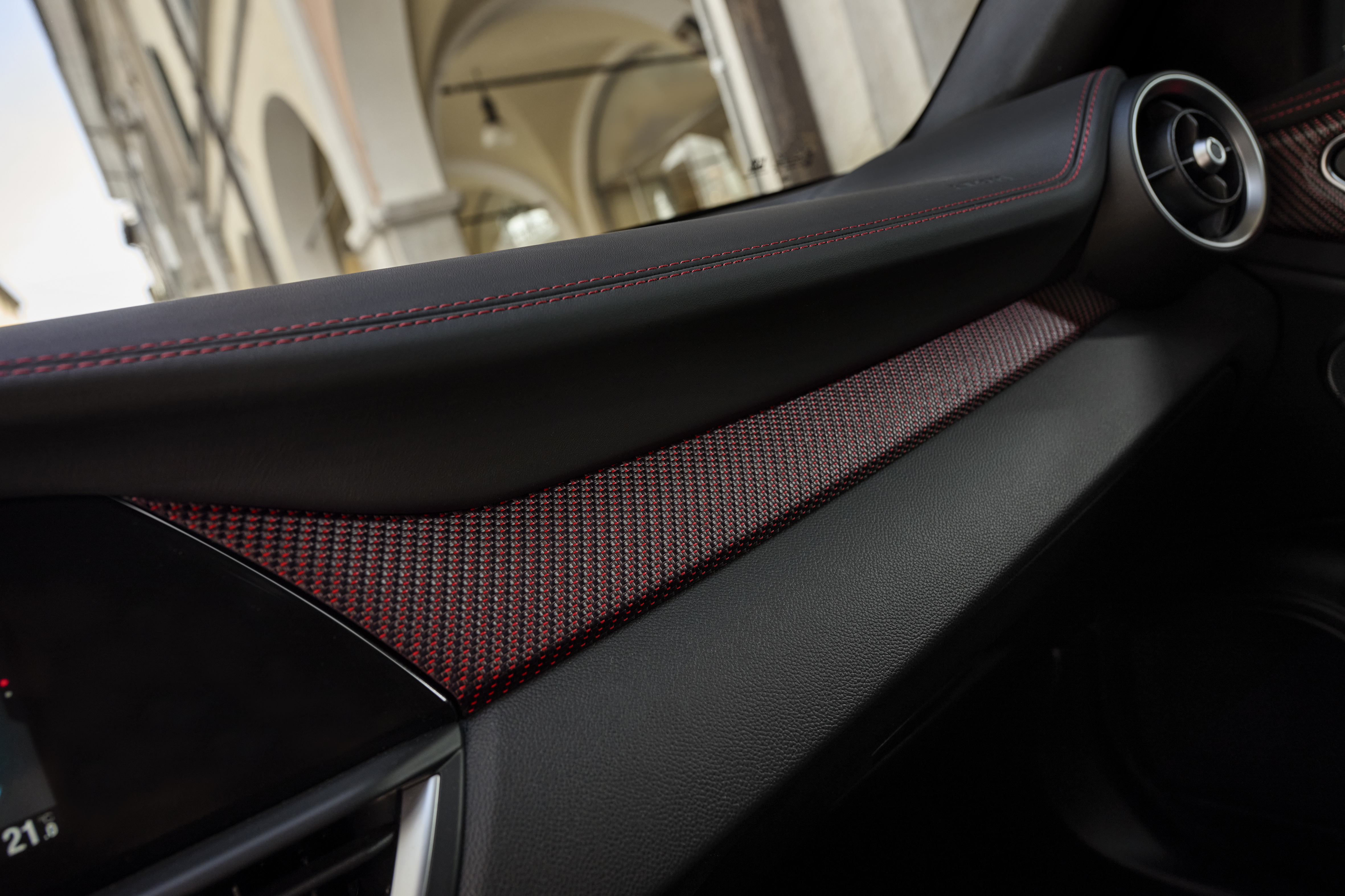 - Instrumentbräda, mittkonsoll och sidopaneler med kolfibermönster "3D-effekt" och röd finish