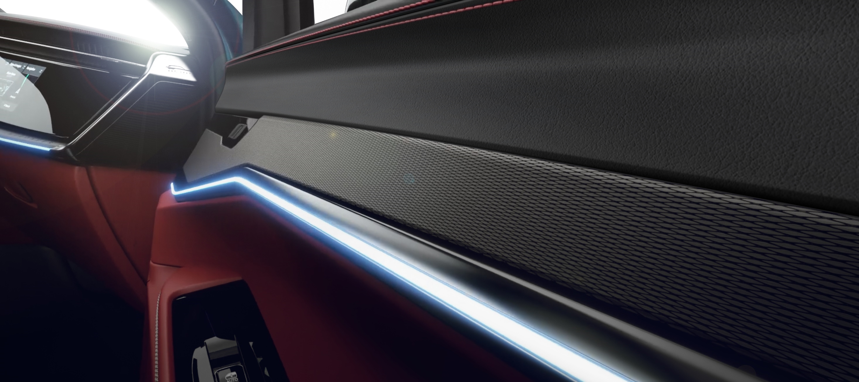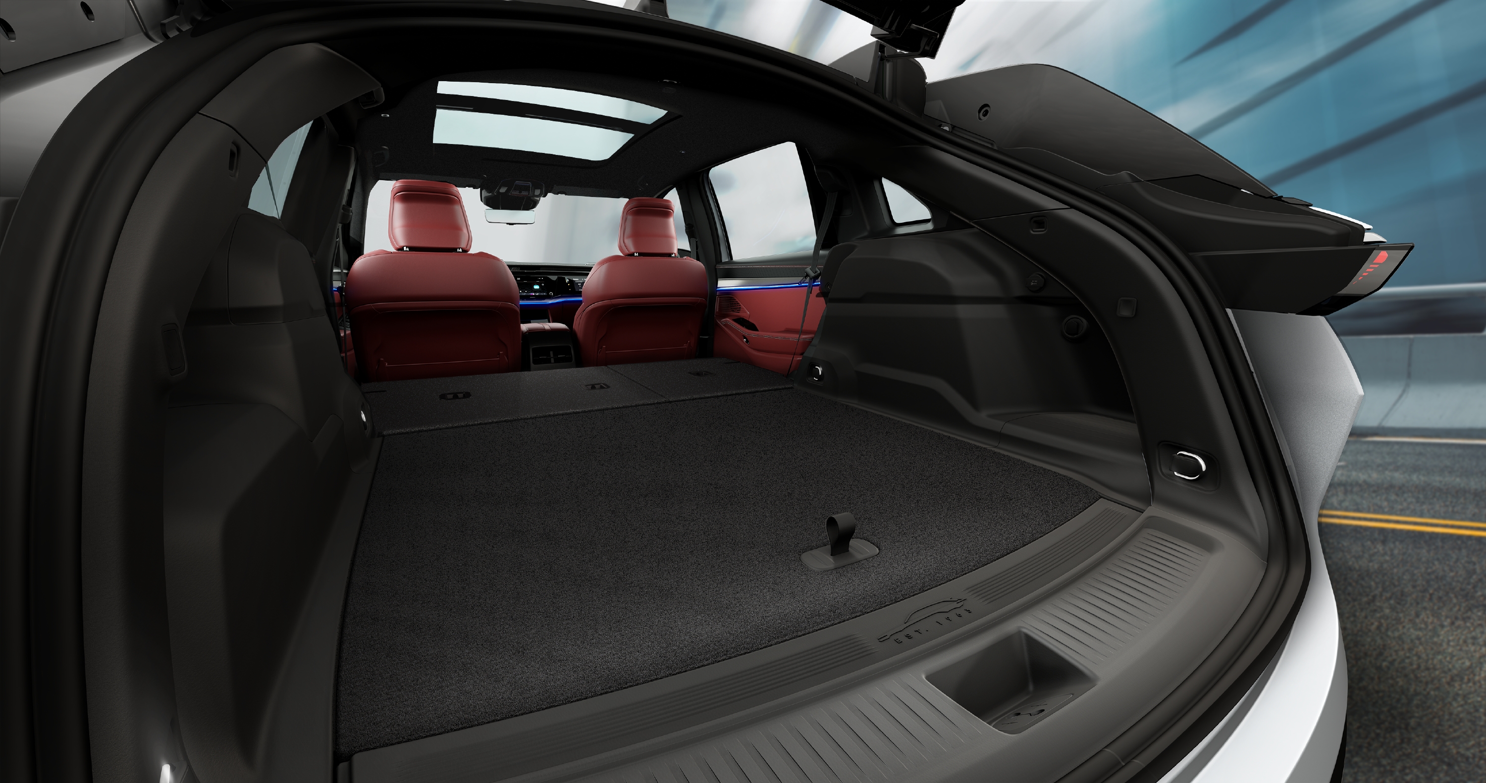 Teknikfylld interiör med totalt 45-tums skärmutrymme –klassledande bland elfordon – med exklusiv interaktiv skärm för framsätespassageraren, uppvärmda och ventilerade fram- och baksäten samt högtalarsystem från McIntosh med 19 högtalare och 1160 W.