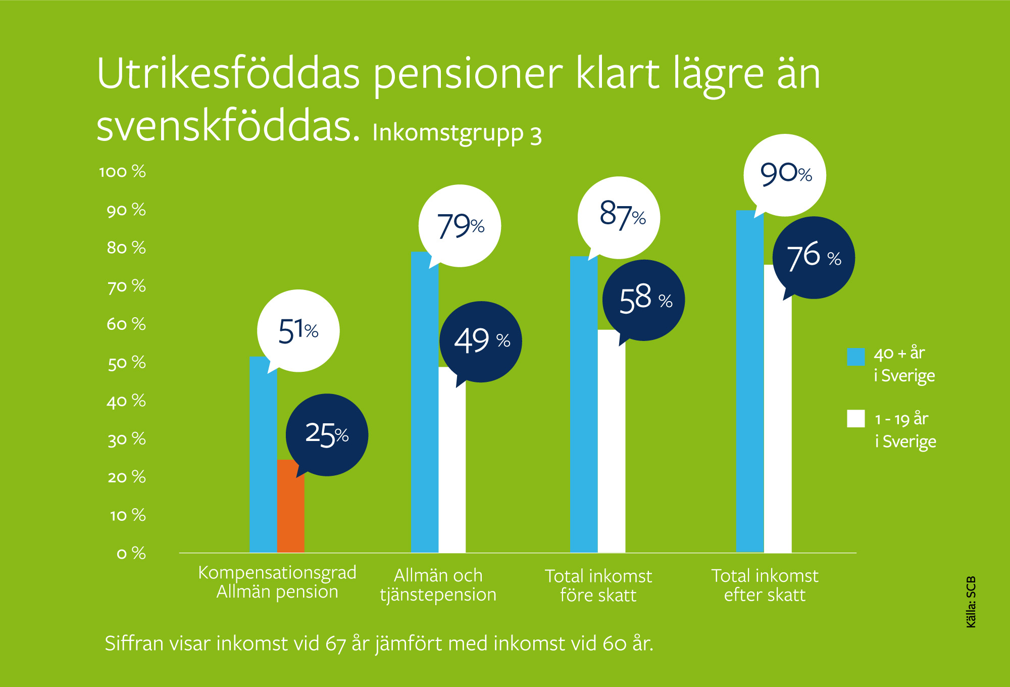 Studien är baserad på deklarerade inkomster 2021 från Statiska Centralbyrån och ingår i Alectas större årliga studie. Förutom att gruppen ”utrikes födda” har lägre allmän pension har de även lägre total inkomst jämfört med övriga svenskar. Medan en person med över 40 år i Sverige, i inkomstgrupp* 3 vid 67 års ålder har cirka 90 procent, efter skatt, av den inkomst han eller hon hade vid 60, är siffran för de med färre än 20 år i Sverige 76 procent.