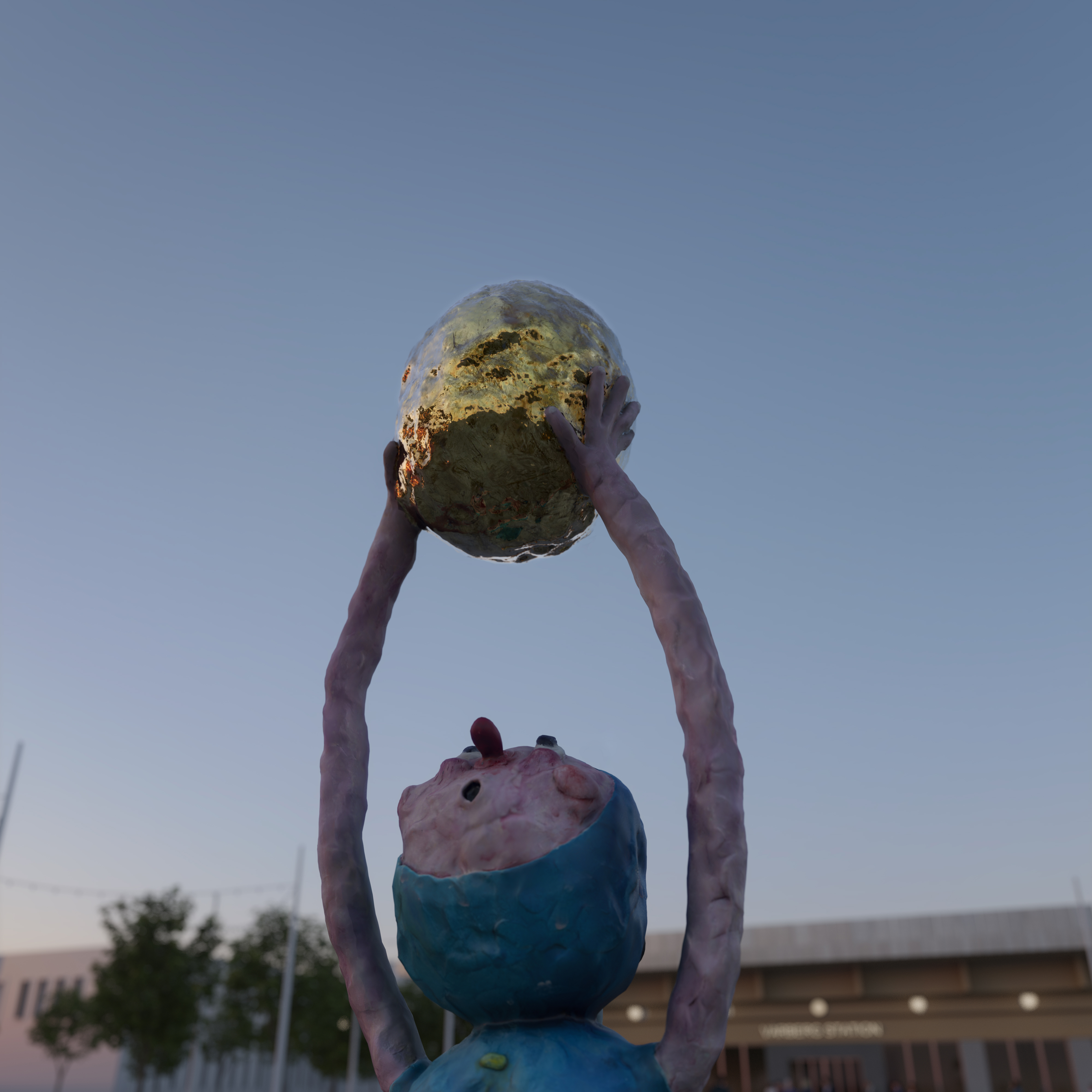 Joakim Ojanens verk står i dialog med konstnären Juri Markkulas verk Amarcord på tågstationens perrong, då horisonten är central som tema för de bägge konstverken. Den ljusblå och rosa patinan i figuren som sträcker sig upp mot himlen för att plocka ned solen återfinns i Juri Markkulas verk som med en ljuddämpande funktion löper över 300 meter längst perrongen som en horisontlinje och skapar en mental bild av västerhavets färg och ljusskiftningar. Amarcord var det första konstverket att stå färdigt i området. Juri Markkula arbetar just nu också med skisser för en gestaltning i det nya stationshuset som på så sätt ska knytas samman med perrongen.