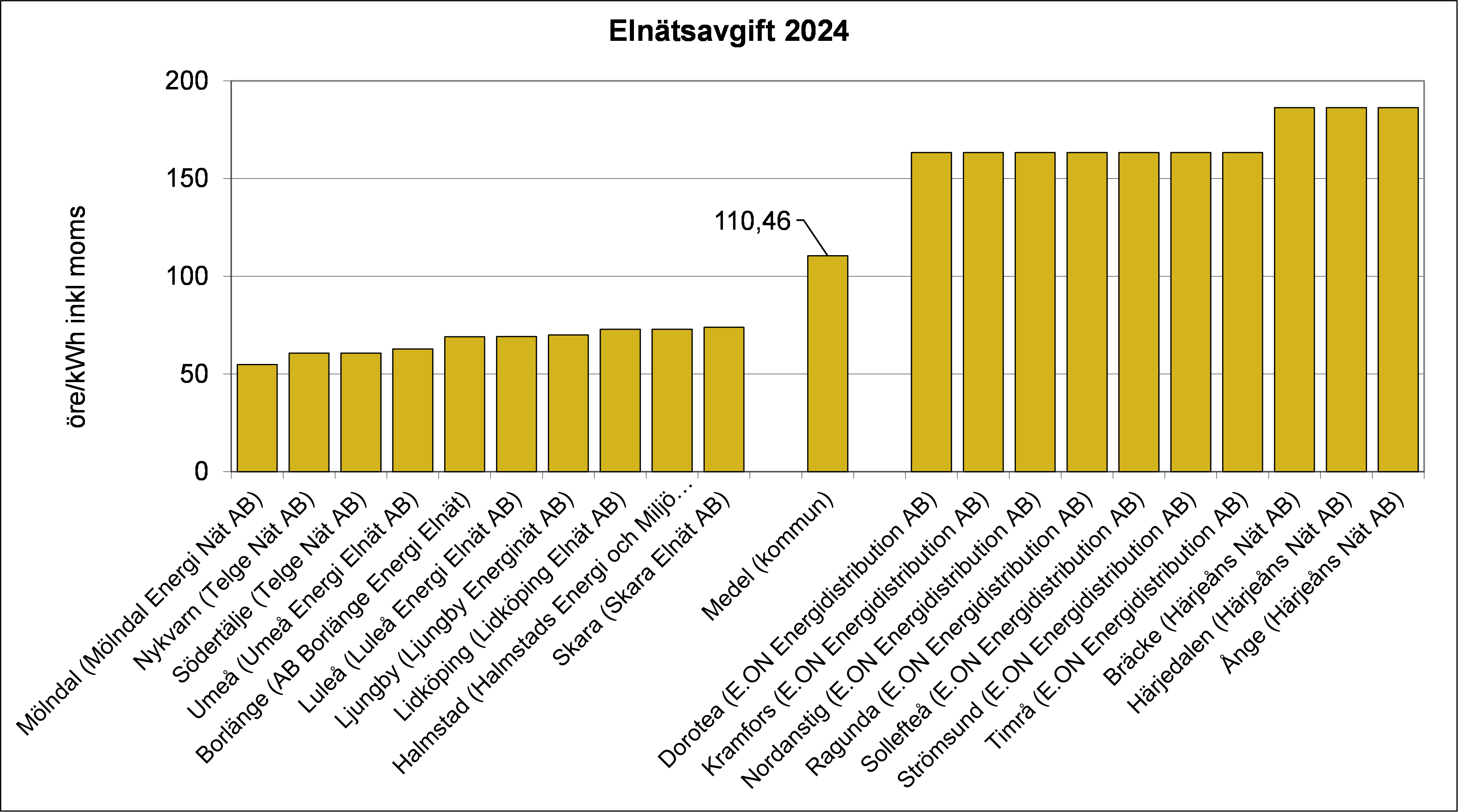 I undersökningen har den årliga elnätsavgiften, enligt de priser som gällde den 1 januari 2024, beräknats för typhuset i Nils Holgerssonrapporten med 15 lägenheter. Varje lägenhet har ett 16A säkringsabonnemang och en årlig elförbrukning på 2 300 kWh. Huset har ett gemensamt fastighetsabonnemang på 35A och 15 000 kWh/år. För varje huvudort i kommunen har ett medelvärde redovisats i öre/kWh inklusive moms utifrån den totala elnätskostnaden för typhuset den 1 jan 2024. Energiskatten för el som sedan 2018 finns med på fakturan från elnätsföretagen är inte inkluderad. Vid framtagande av kostnadsdata för årets rapport (2024) identifierades att ett antal elnätsleverantörer börjat basera del av överföringsavgiften på rörligt spotpris. För denna del används i Nils Holgerssonberäkningarna medelpris för perioden juli 2023 t o m juni 2024.