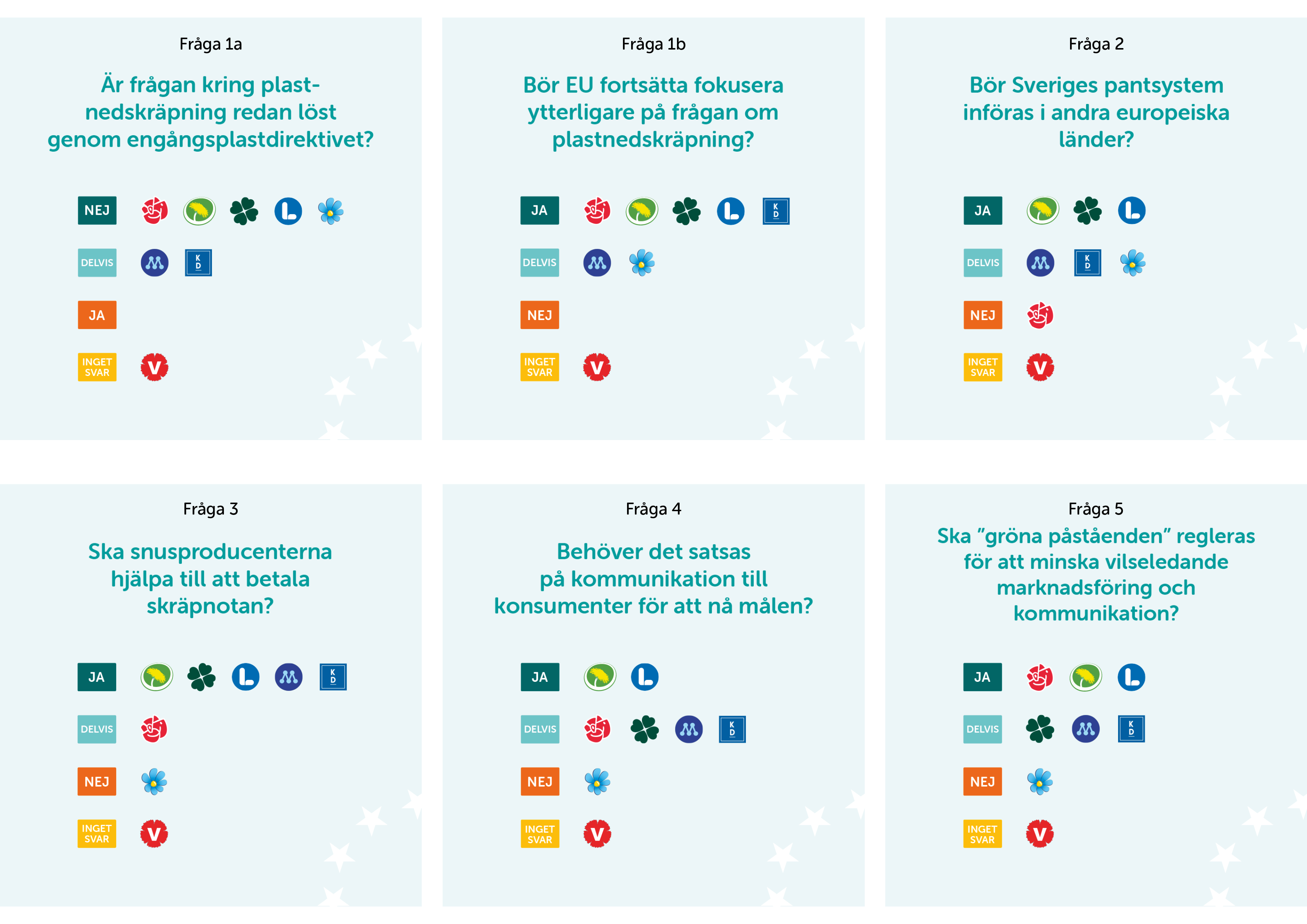 De flesta partier tar tydligt ställning och är överens om, eller lutar åt, att frågan kring plastnedskräpning inte är löst genom den redan implementerade lagstiftningen kring engångsplastdirektivet (fråga 1a) och att EU fortsatt behöver fokusera på frågan (fråga 1b). En majoritet av partierna tycker också att snusproducenter ska ta sitt producentansvar genom att hjälpa till att betala notan för insamling och uppstädning av nedskräpningen (fråga 3).